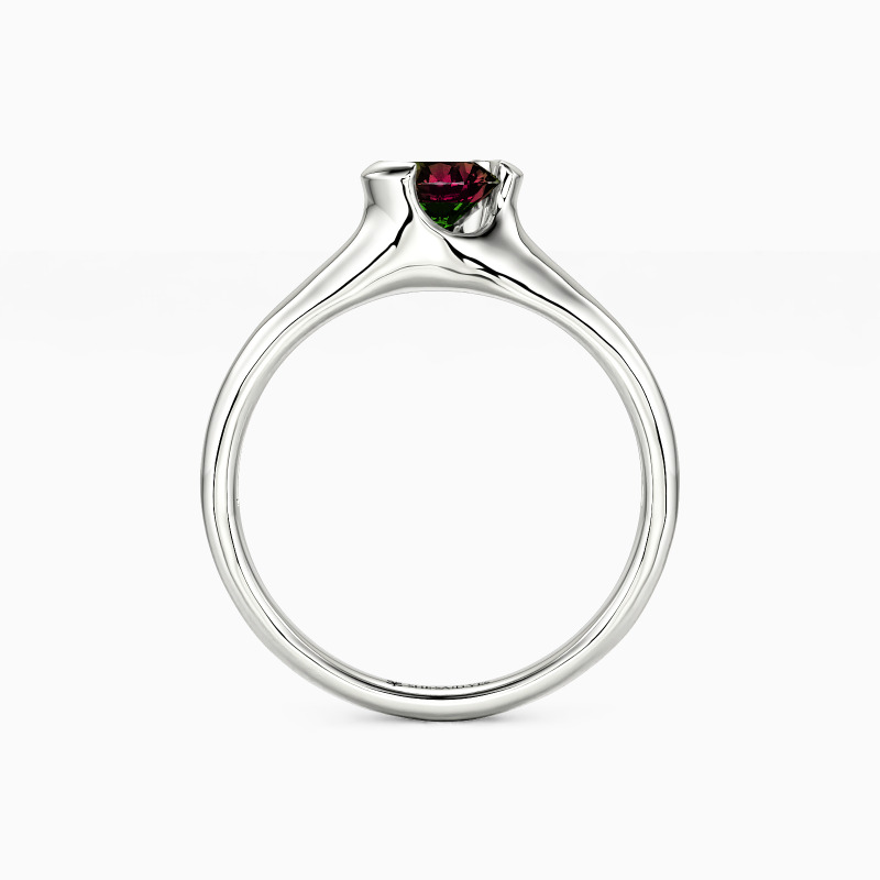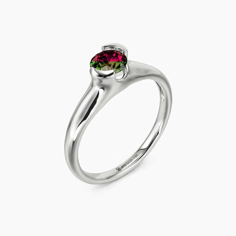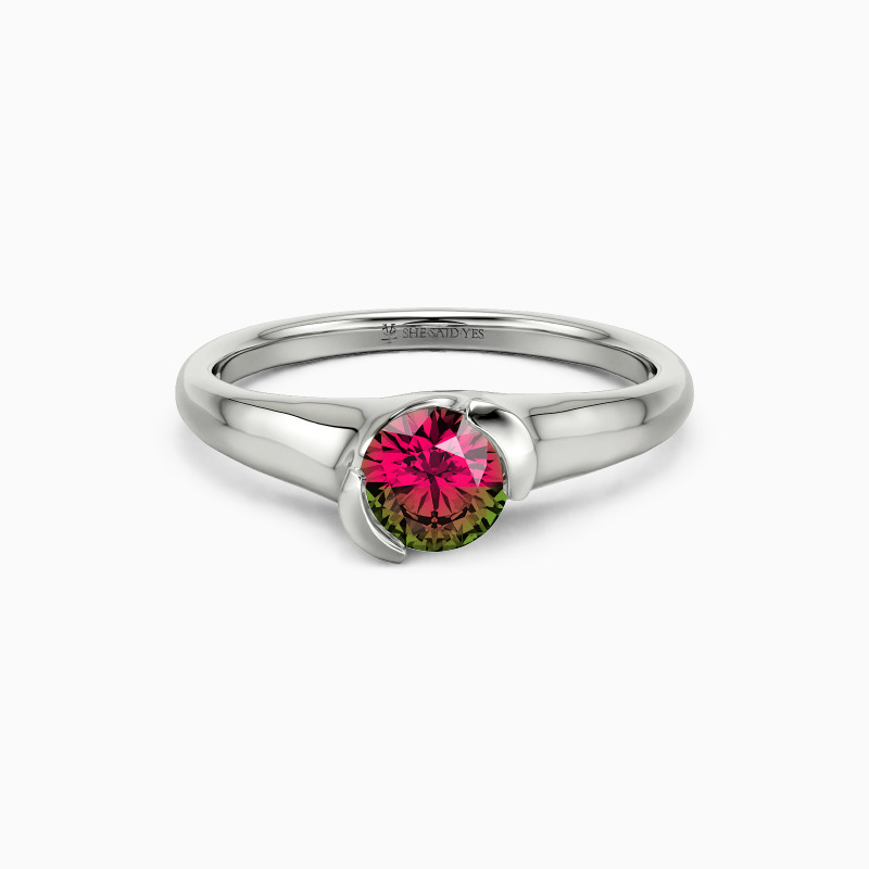 As a classic modern engagement ring, this dainty piece features a gleaming round-cut stone in the middle, wrapped by a precious unsymmetrical half-bezel, secretly revealing a touch of sheen to show your unique contemporary style.
