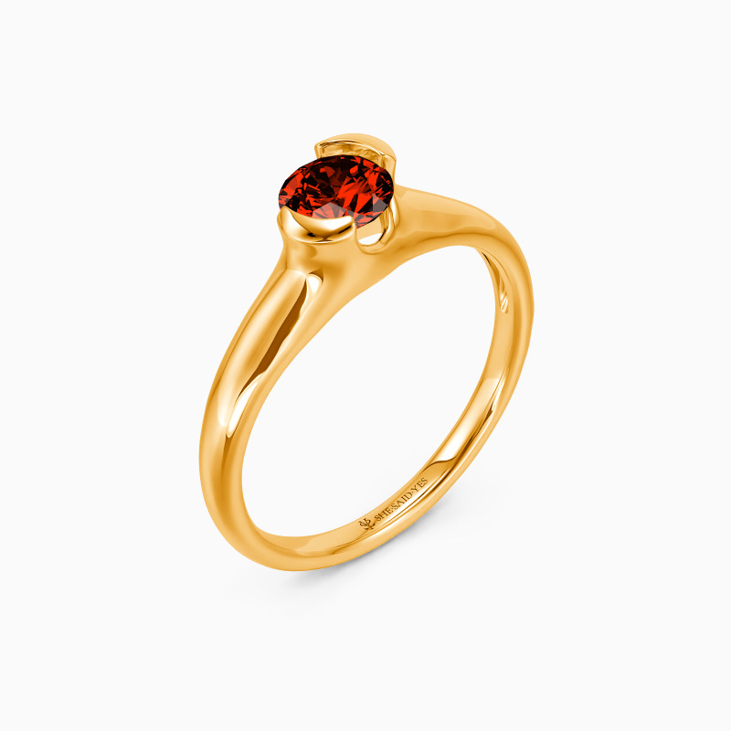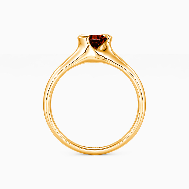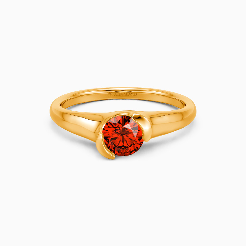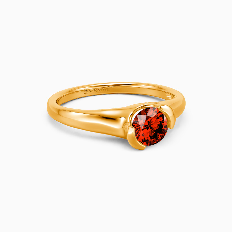 As a classic modern engagement ring, this dainty piece features a gleaming round-cut stone in the middle, wrapped by a precious unsymmetrical half-bezel, secretly revealing a touch of sheen to show your unique contemporary style.