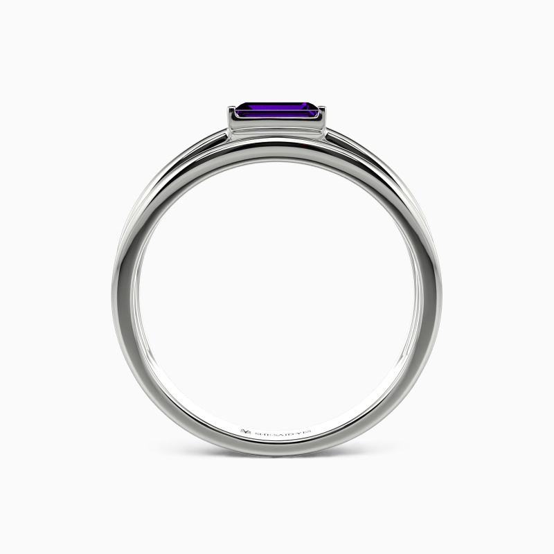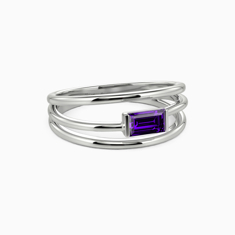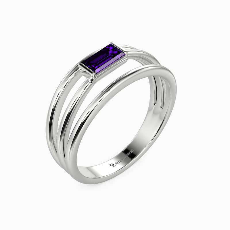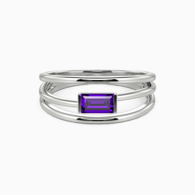 Three lustrous shanks are effortlessly stacked with a glimmering emerald-cut stone. Wear it alone permits you to show minimalistic glamour, and it also can perfectly stack with other rings. In addition, you can customize the color of metal and stone you like.
