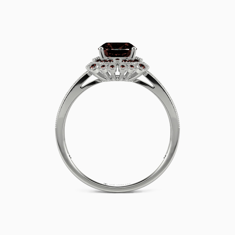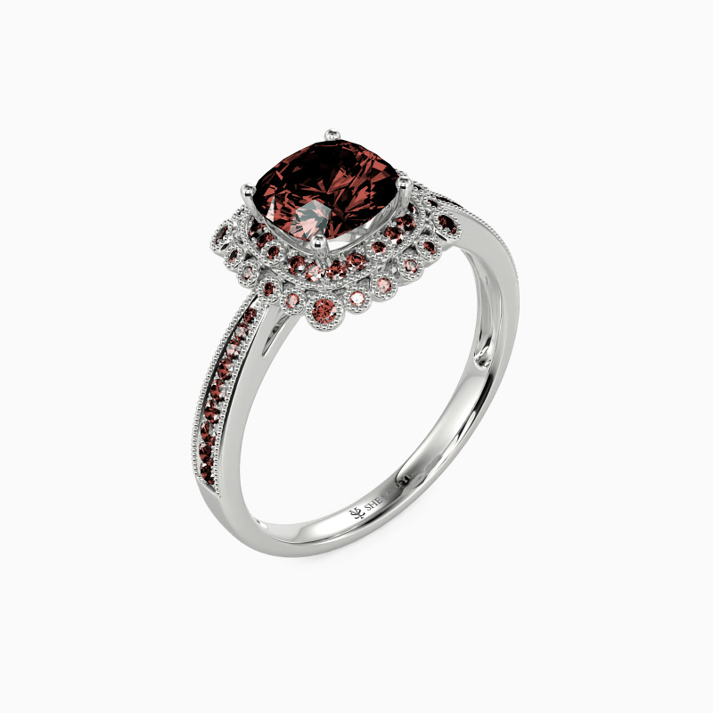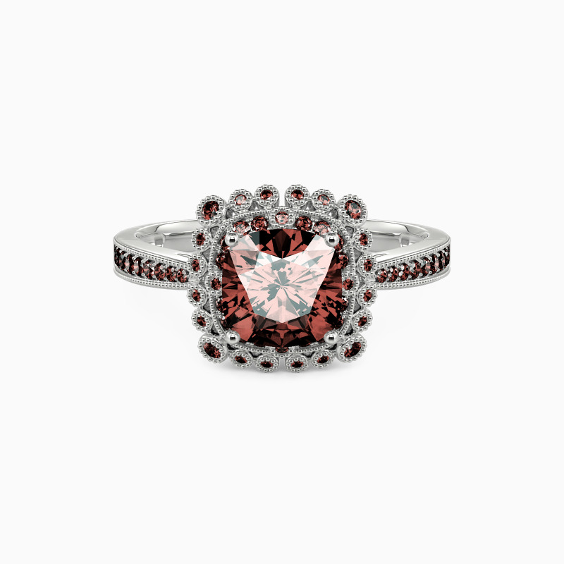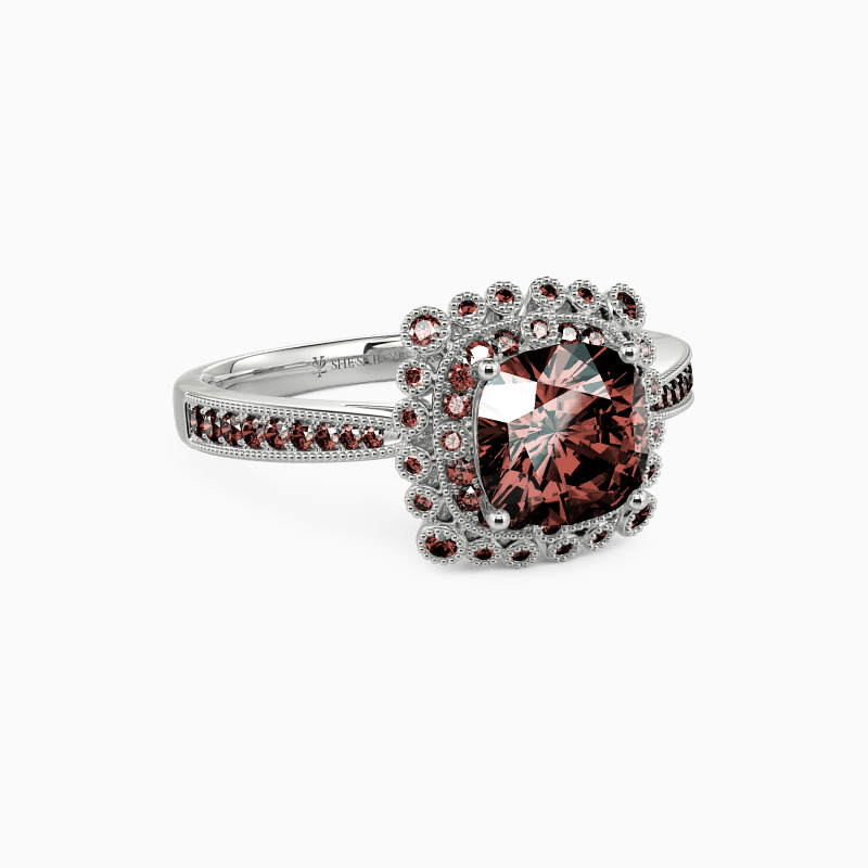 With milgrain details, the tapered shank adds even more allure to the whole ring. This engagement ring features a cushion-cut center stone at center stage surrounded by a halo of accents and captivating from all angles. Give all your best to her, and adorn her finger with this glamorous charm.