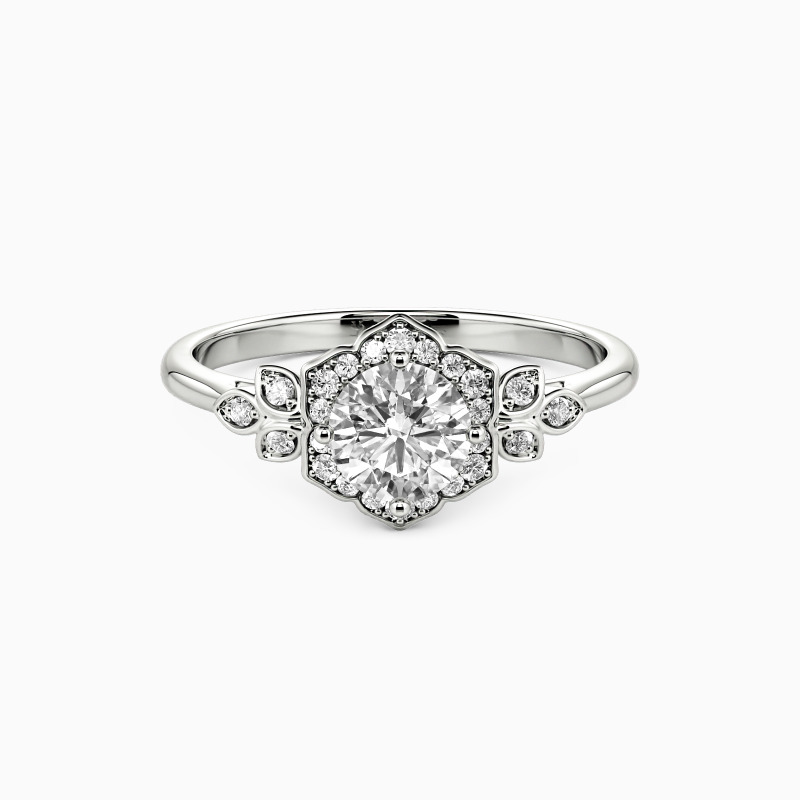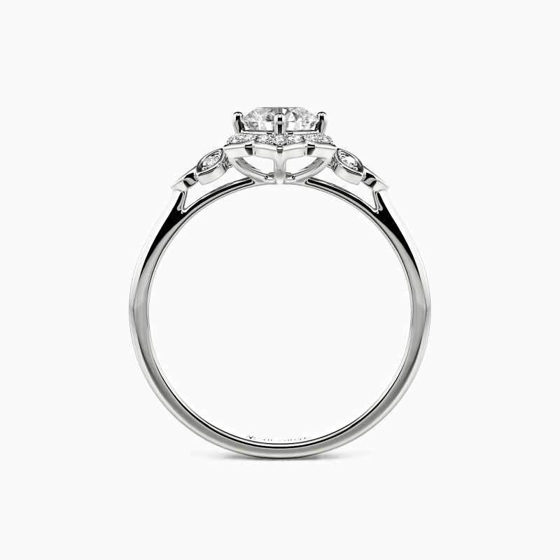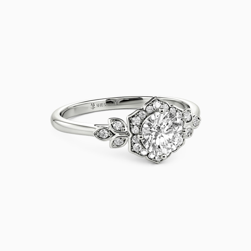 With a brilliantly polished cathedral shank, this halo engagement ring is crafted in enduring precious metal with scintillating prong setting gem accents. Many glimmering leaves surround the head complete a floral look of the whole ring. Give this stylish ring to the beautiful her, and promise to be with her every spring.