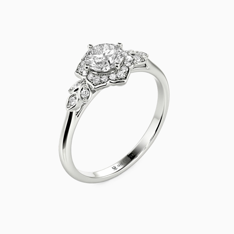 With a brilliantly polished cathedral shank, this halo engagement ring is crafted in enduring precious metal with scintillating prong setting gem accents. Many glimmering leaves surround the head complete a floral look of the whole ring. Give this stylish ring to the beautiful her, and promise to be with her every spring.