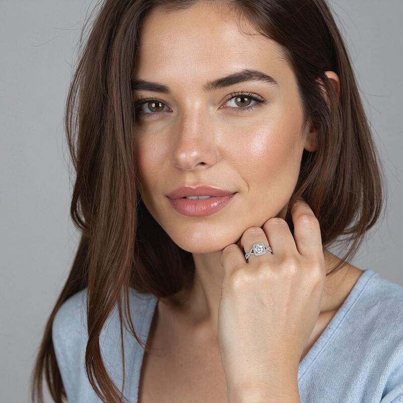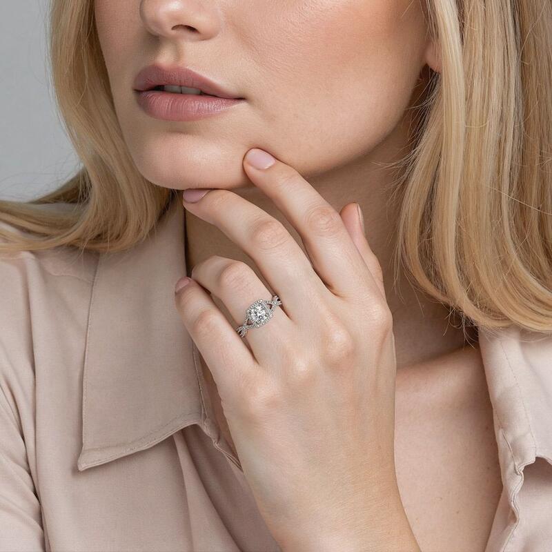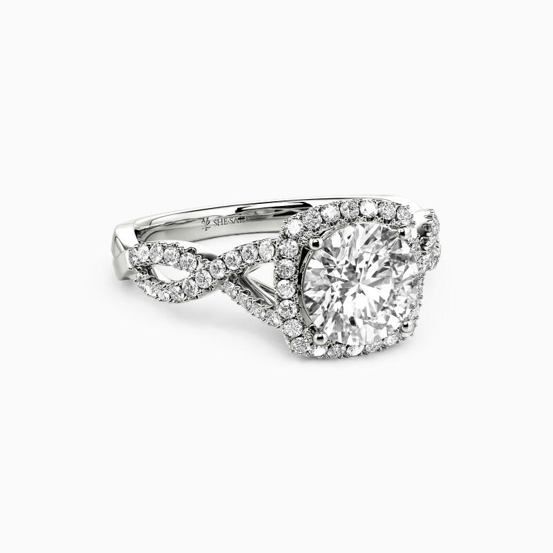 Capture every moment of your love with our unique halo engagement ring. It features a round gem in the center with a square halo shining the maximum light. The twisted shanks cross over each other to the center with a gleaming pavé setting, presenting a fascinating charm to your gorgeous attires.