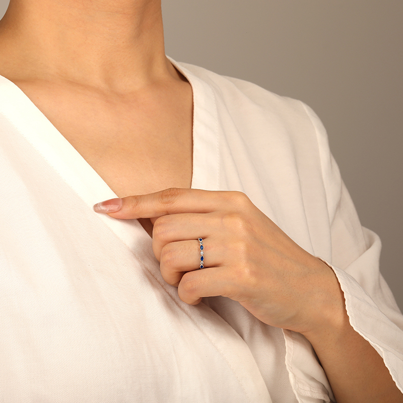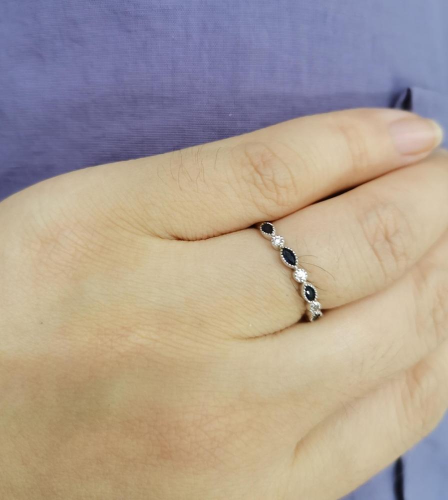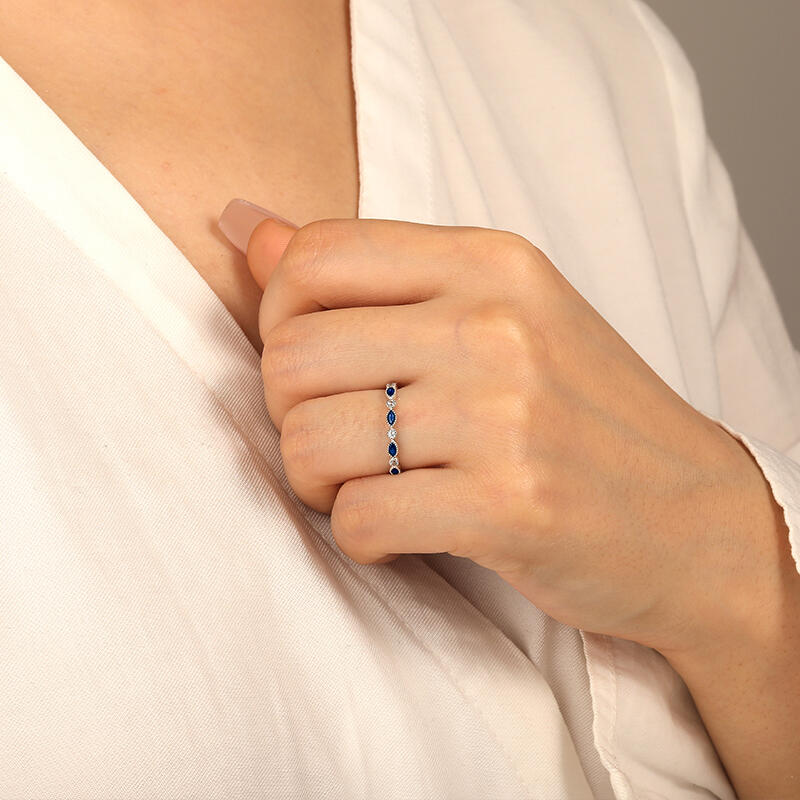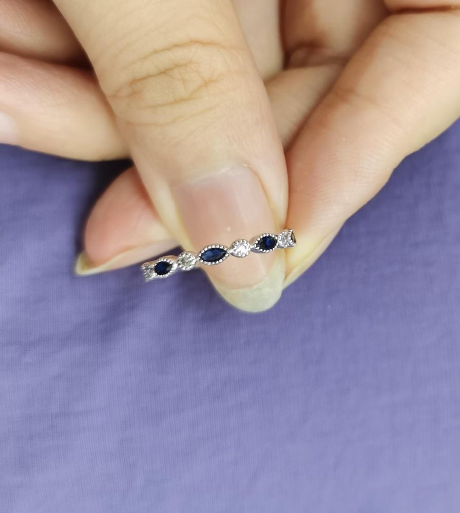 This wedding band unveils glistening round-cut and marquise-cut accents alternatively studded on the polished shank. And two lines of milgrain wrap under and over each stone to form the outer edges of a bezel setting. Pair it with your engagement ring to create a gorgeous bridal set, or wear it alone to finish a stylish look.