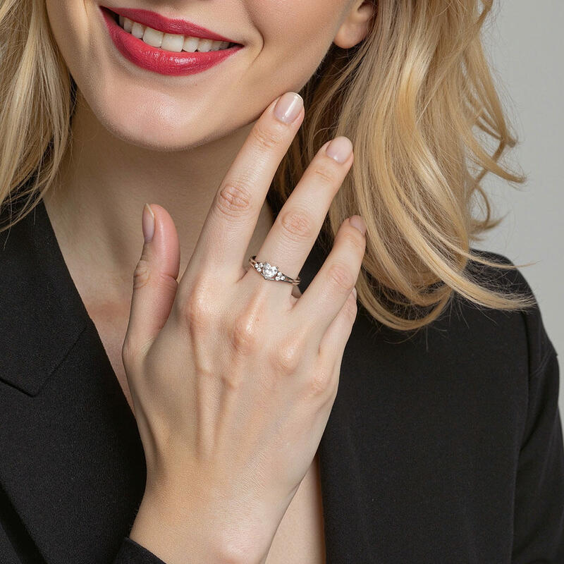 A Heart-shaped stone is set in three prongs; three small accents surround a triangle shape glistening on each shoulder; the split shank elevates this engagement look and completes this style. Promised from the day forward, she will never walk alone, your heart would be her shelter, and your arms would be her home.