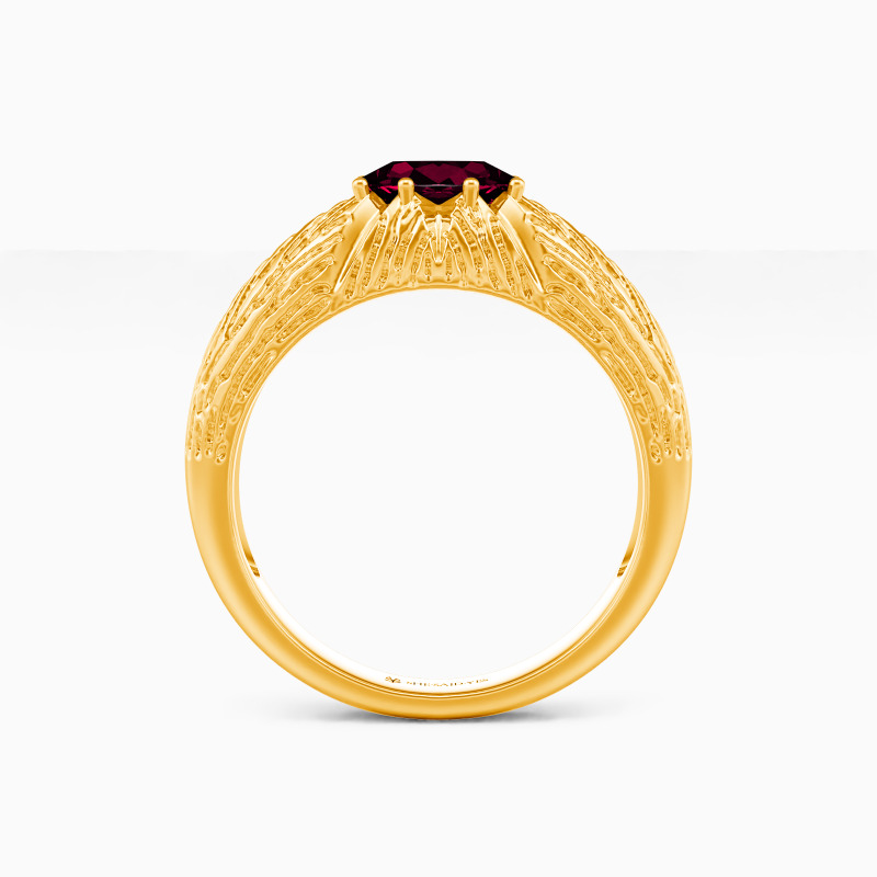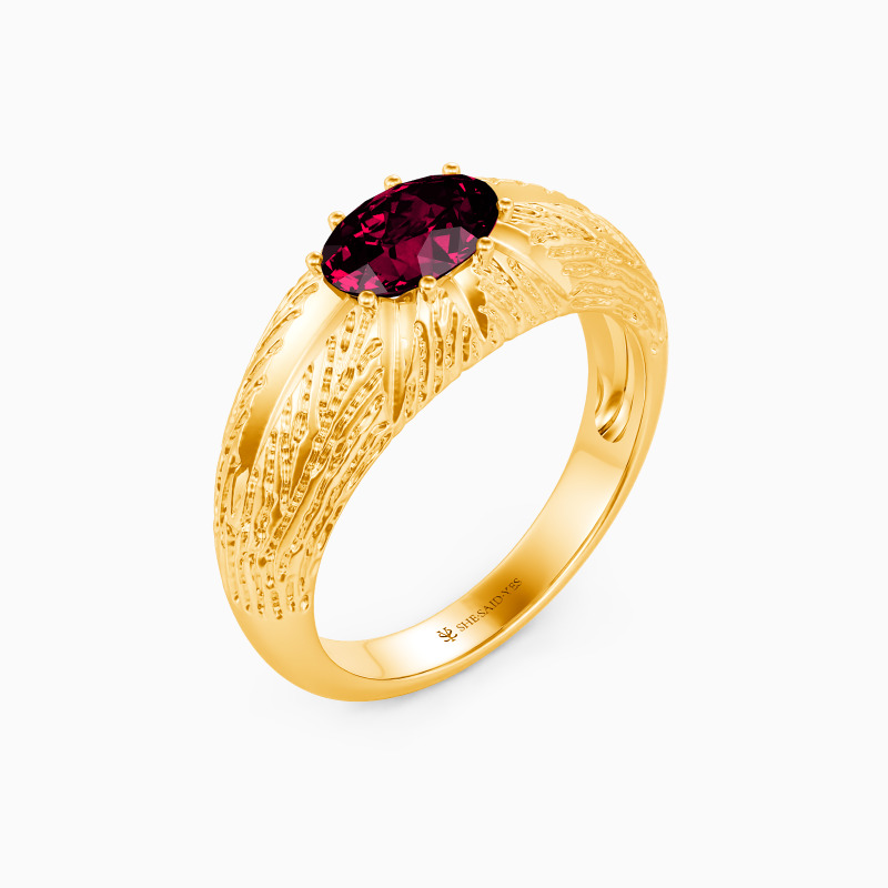 Captivated your sight by the distinctive design, this dome ring showcases the ultimate brilliance of SHE·SAID·YES. It embeds a sparkling oval-cut gem engraved with eight shiny rays from the center on the intricately carved texture on the dome top. This vintage ring of unparalleled radiance will lead you to travel through the metaverse.