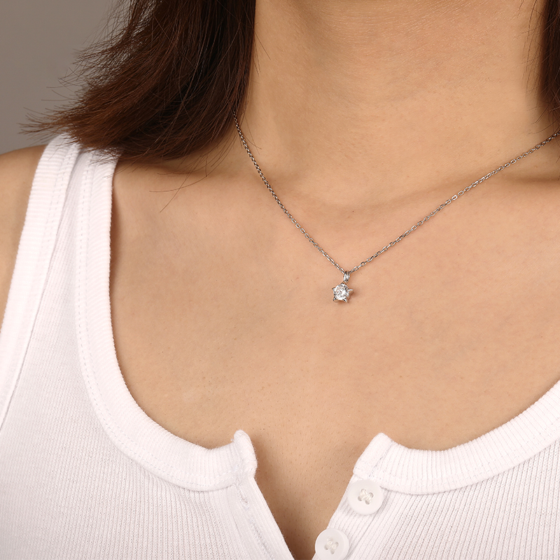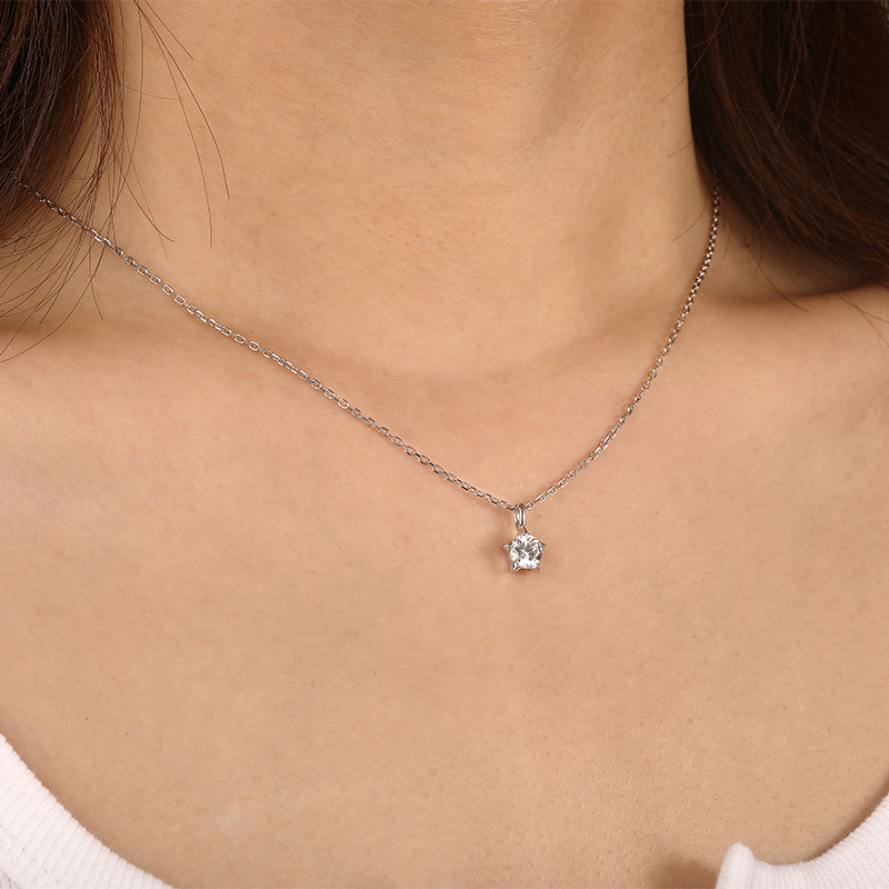 Existing in its timeless and minimalist, this pendant studs a brilliant round-cut stone encased by a delicate five prongs. Showing an appealing star silhouette with a glint of gloss, this dainty piece is the best everyday wearing accessory for you.