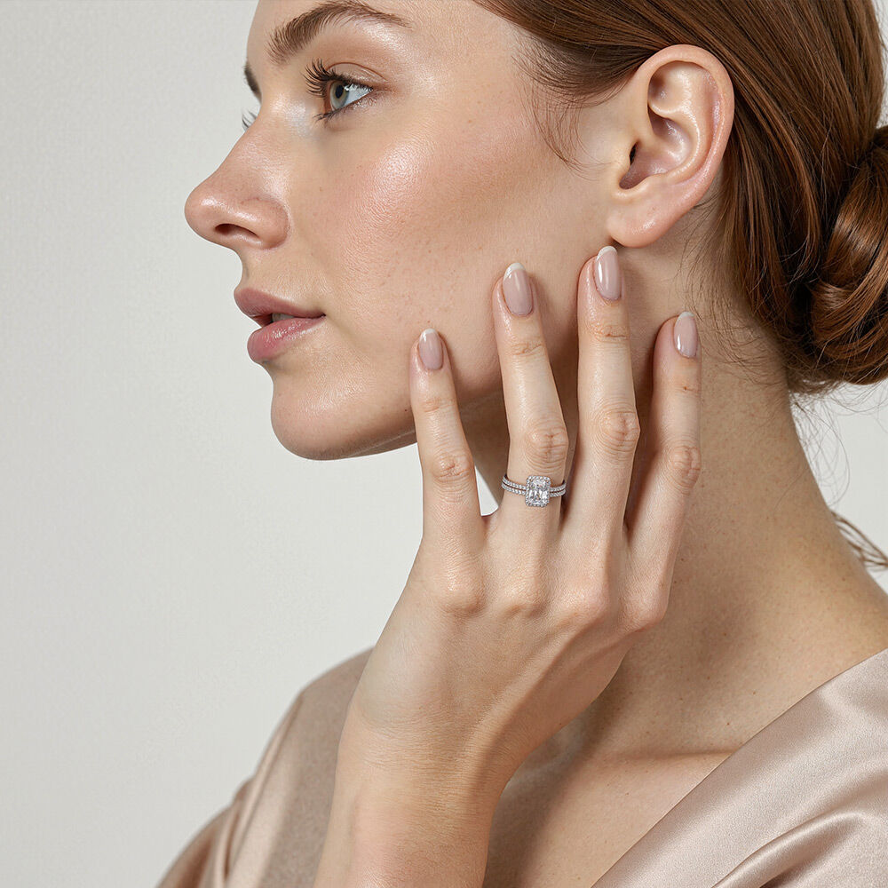 On the most important day, surprise her with this glistening bridal set. This exquisite style sets a brilliant radiant-cut stone in the center, surrounded by a shimmering halo frame. The shank of both engagement ring and matching band are illuminated with paved accents in a semi-eternity fashion. The excellent luster reflects all the glamour this bridal set can take to you. An elegant set for a sophisticated bride-to-be.