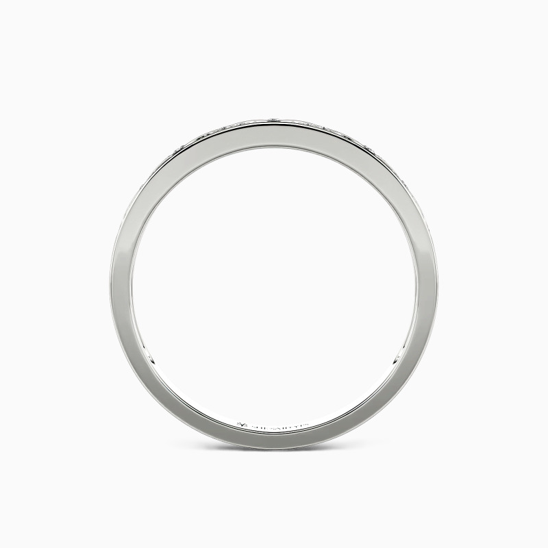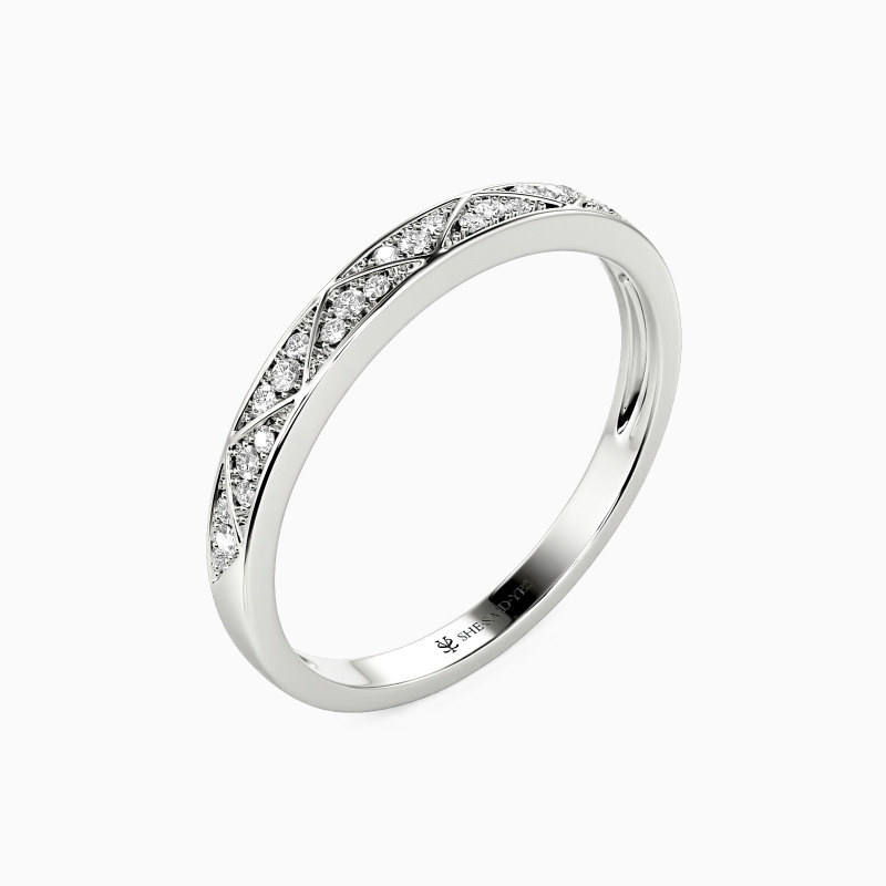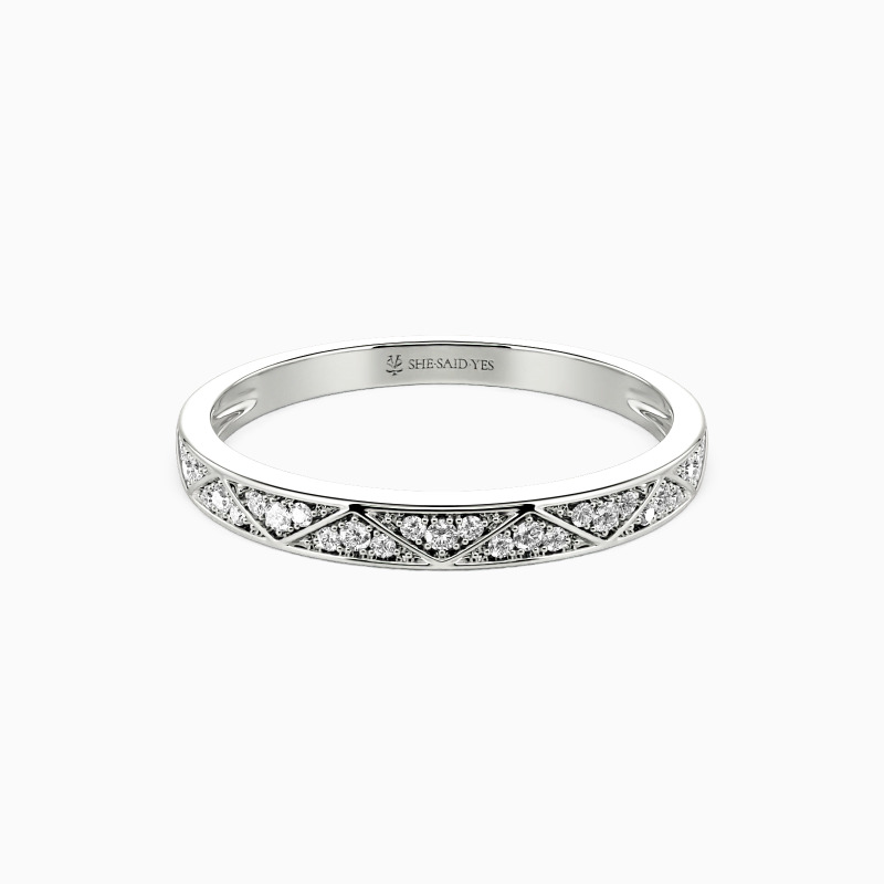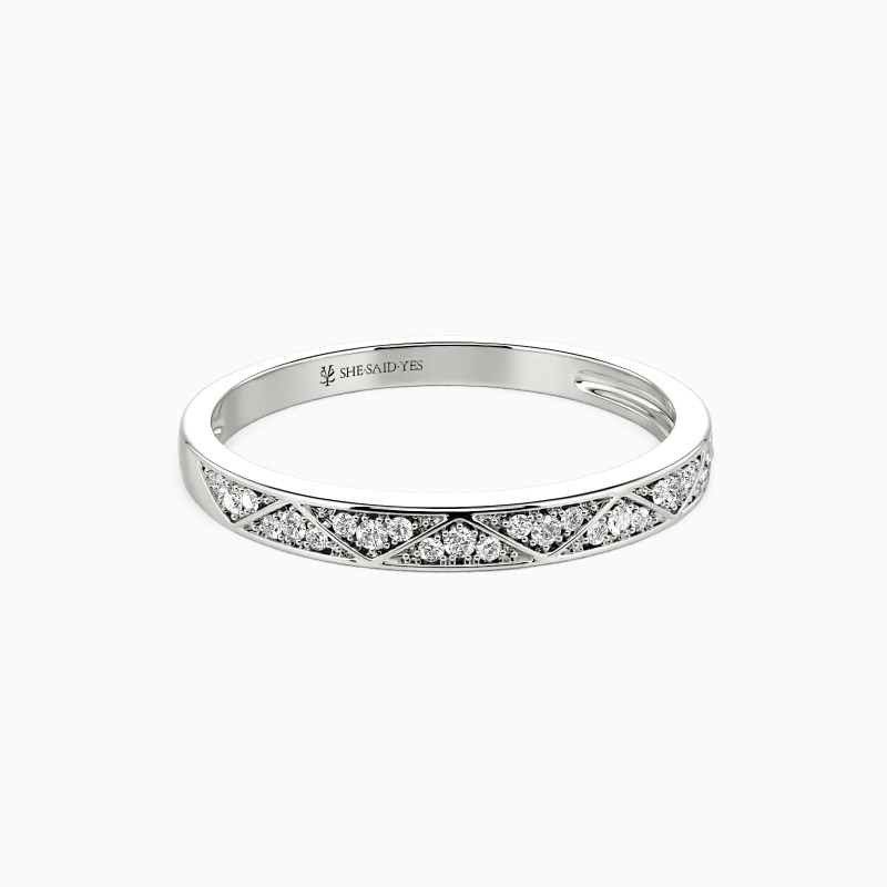 Be the spotlight with this geometric aesthetic wedding band. Twinkling round-cut accents vary in size set in a shared prong within the triangle frame for an encrusted look. This style allows reflecting more lights from all angles. There is no heart for me like yours in the world, and my vow is the best announcement.