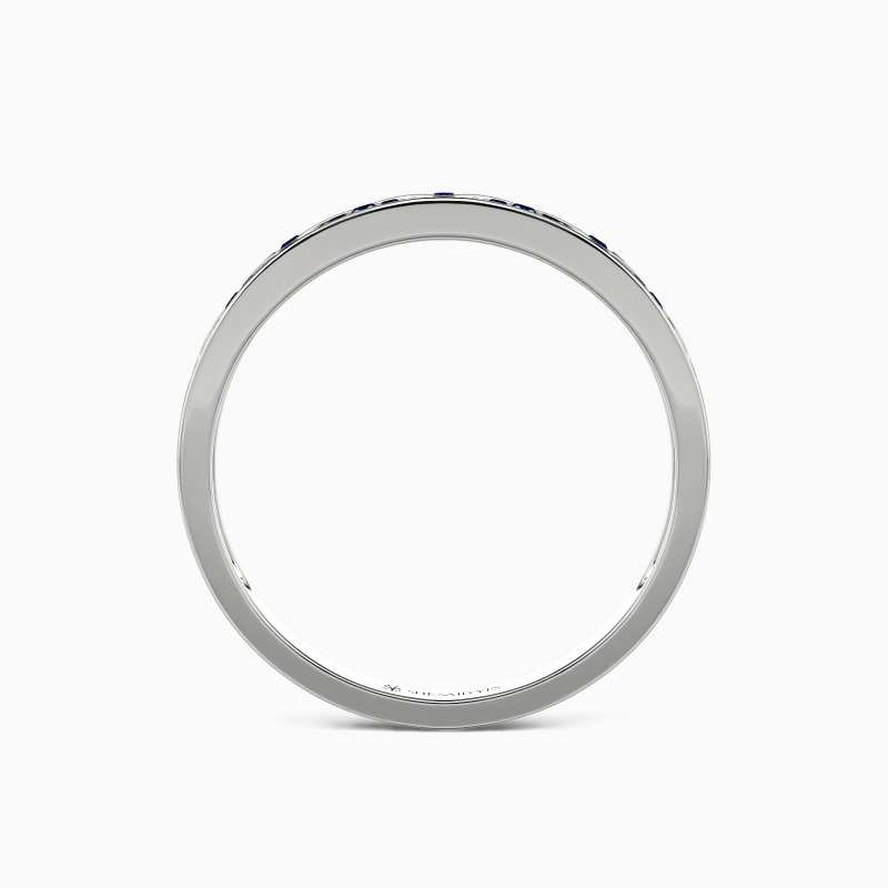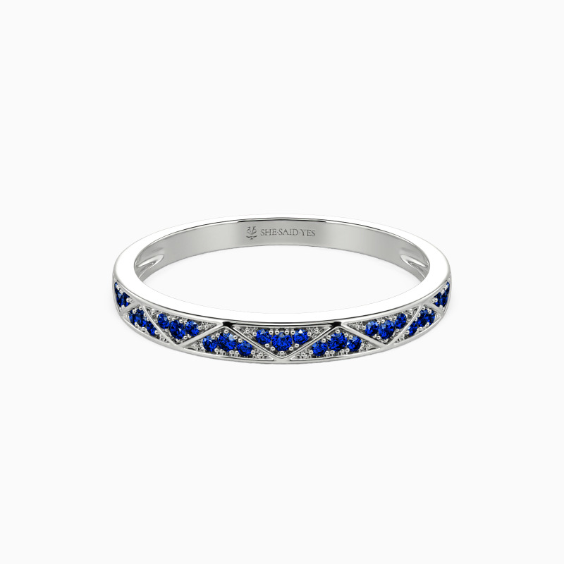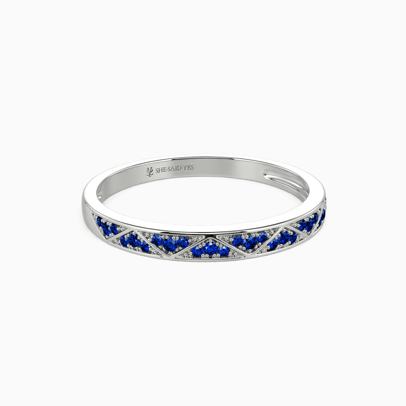 Be the spotlight with this geometric aesthetic wedding band. Twinkling round-cut accents vary in size set in a shared prong within the triangle frame for an encrusted look. This style allows reflecting more lights from all angles. There is no heart for me like yours in the world, and my vow is the best announcement.