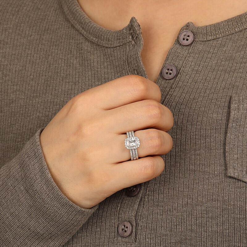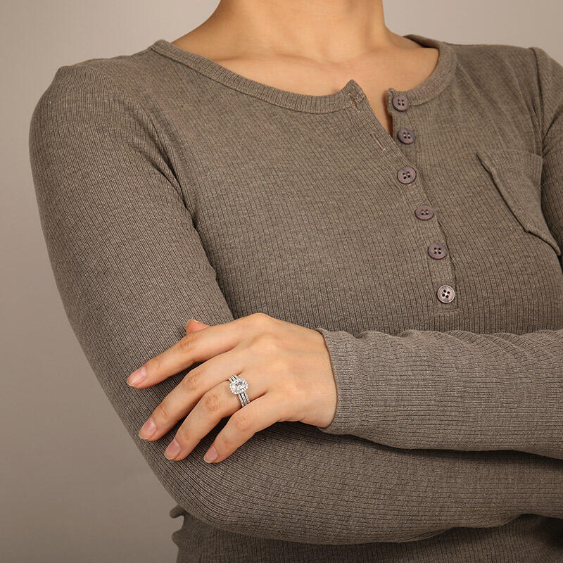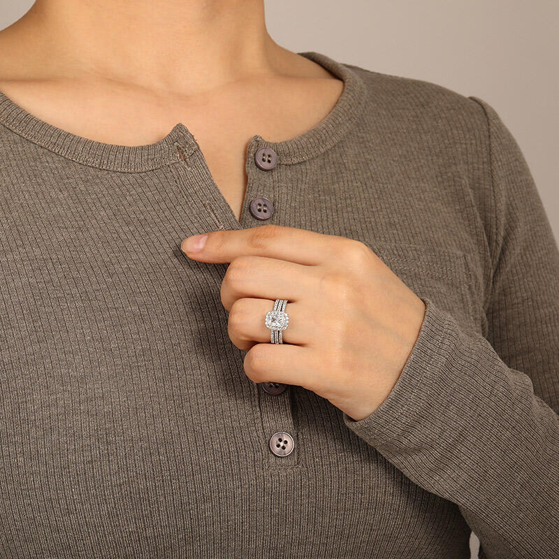 Drawing parallels to the harmonious partnership, this bridal set features delicate bands that glimmer with paved accents. A dazzling halo wraps around the Elongated Cushion cut center stone for an elegant, chic look. An elegant bridal set that expresses eternal love.