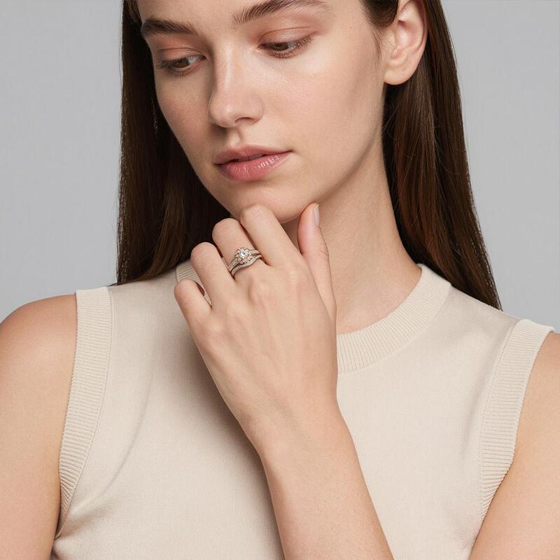 True love at first sight. The engagement ring features a magnificent lotus, set with a round-cut center stone as a pistil. Every lotus petal is also adorned with glistening small round stones, adding more sparkle to the ring. Accents on the band give a further boost of extra sparkle. The classic wedding band gets a chic update with a slightly contoured design. Showcasing a row of sparkling stones in a subtly graduated design. It will absolutely make your heartbeat.