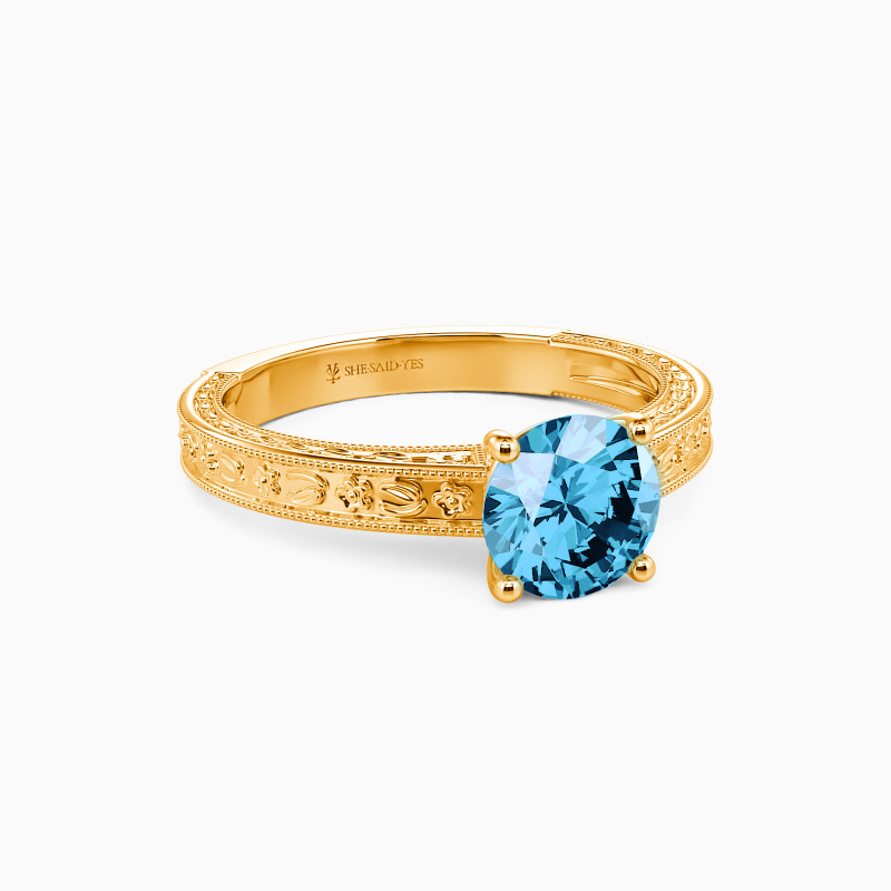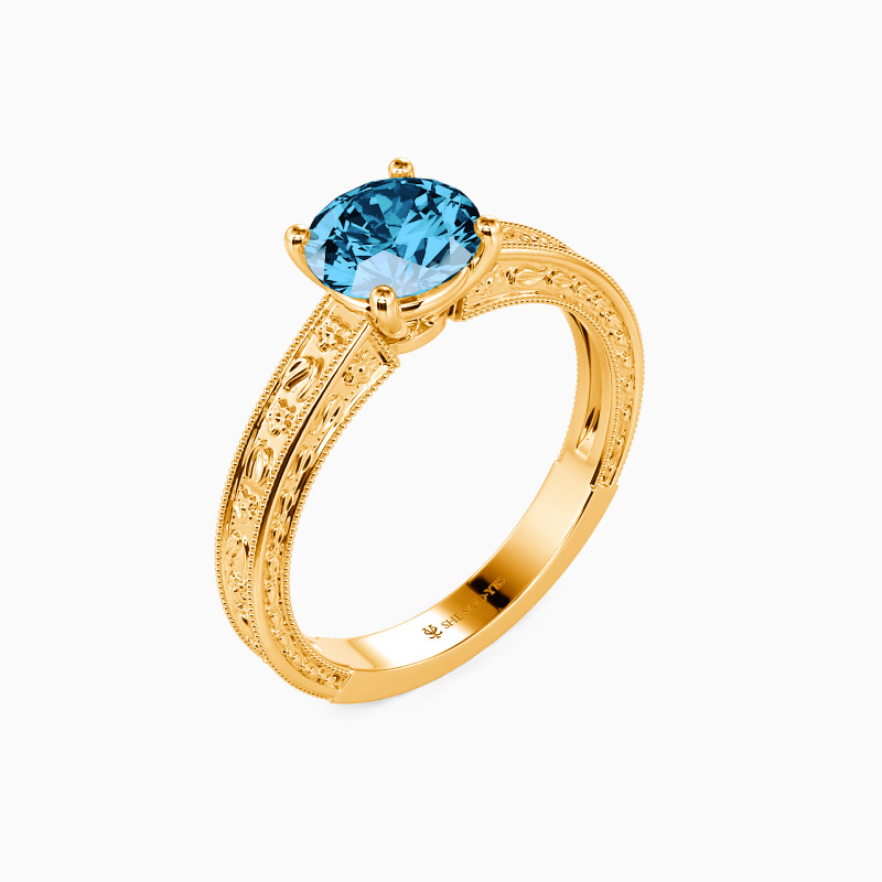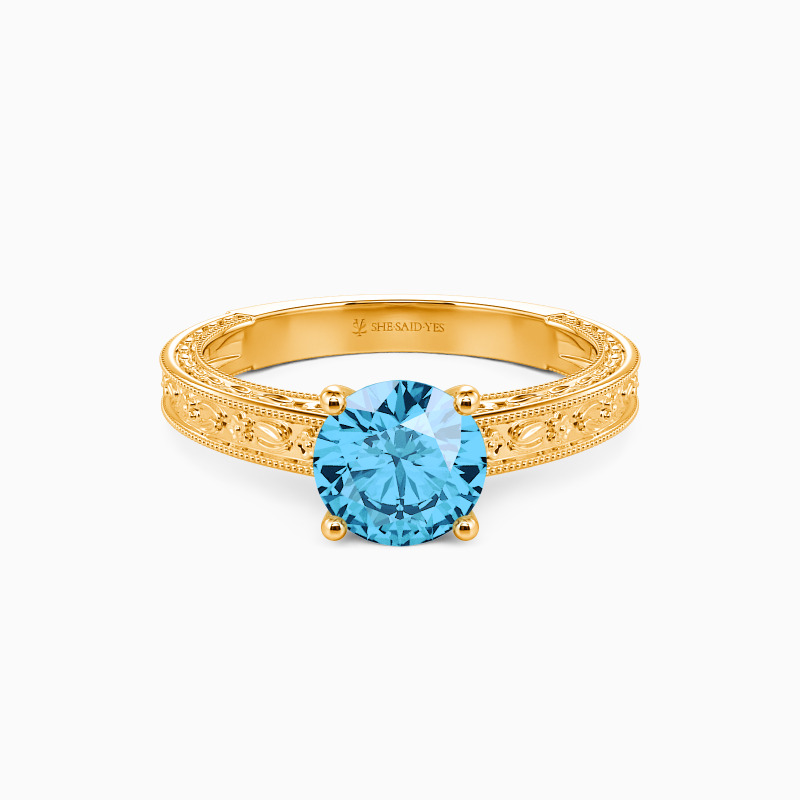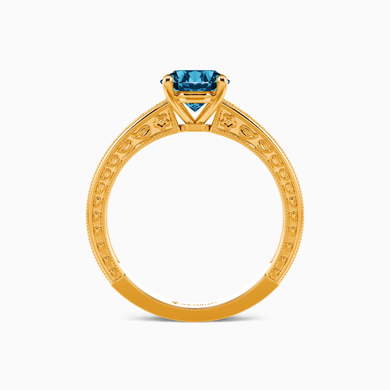 Portray your elegance and beauty with the flawless sparkle. This solitaire engagement ring holds a shimmering round-cut stone in the center. It is in a four-prong setting and adorned beautifully by the detailed milgrain outline and engraved natural patterns to your appeal. You are my cure, I can only be cured in your presence, and love will lead us whatsoever.
