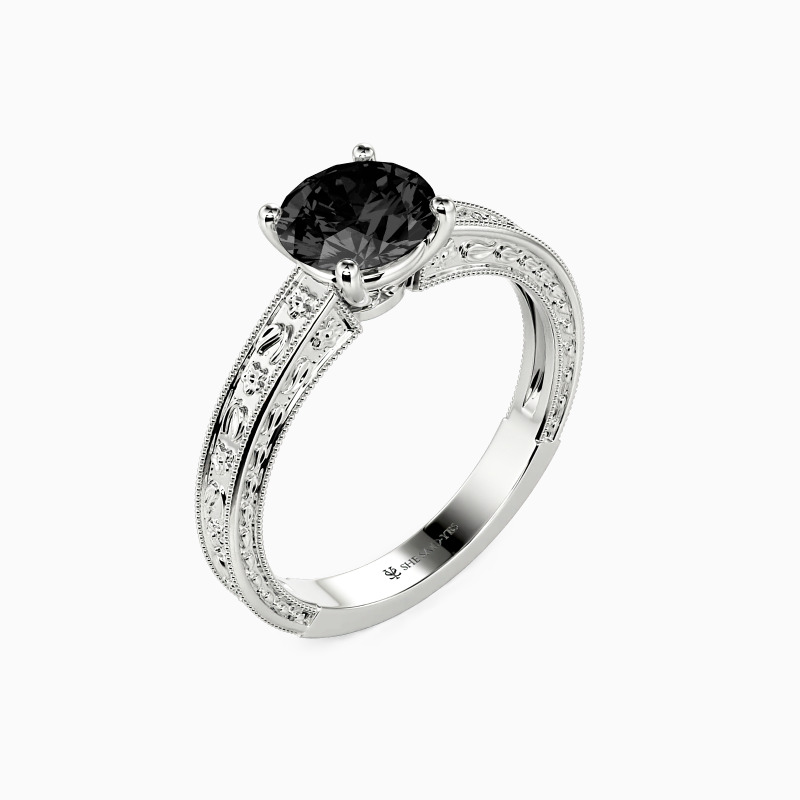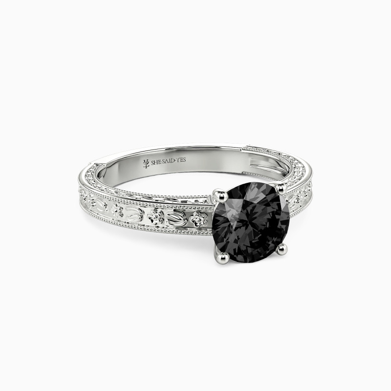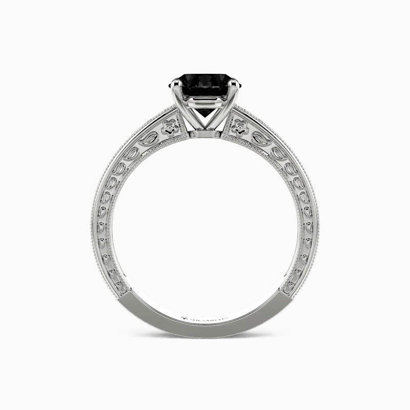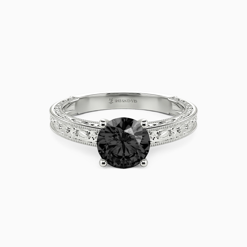 Portray your elegance and beauty with the flawless sparkle. This solitaire engagement ring holds a shimmering round-cut stone in the center. It is in a four-prong setting and adorned beautifully by the detailed milgrain outline and engraved natural patterns to your appeal. You are my cure, I can only be cured in your presence, and love will lead us whatsoever.