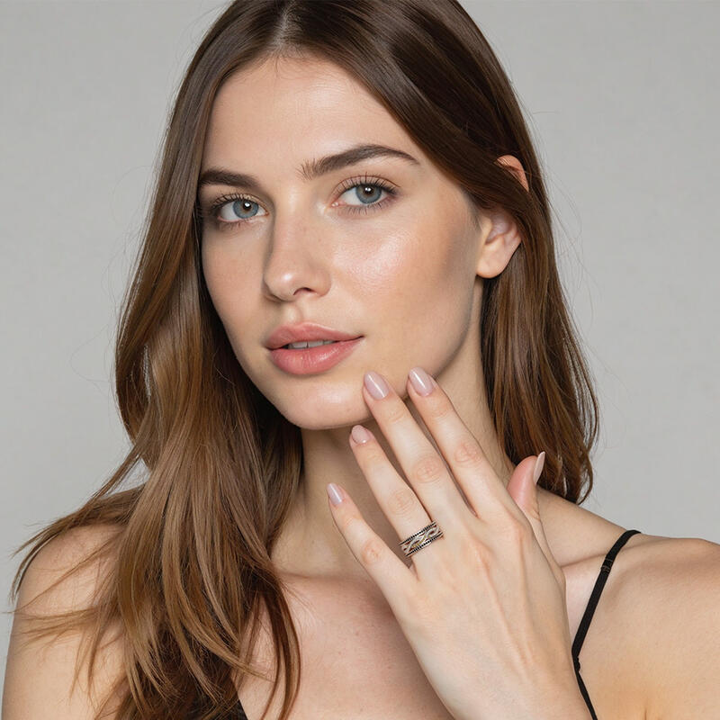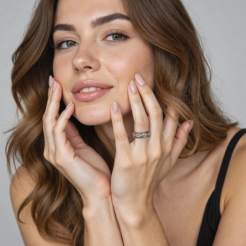 This gorgeous wedding band catches your eyes with its unique design. An array of round-cut stones stud in a pavé setting held on the two intertwined shank. The sparkle of the ring is further amplified by two rows of glittering embellishment on edge. Stack it with your engagement ring or wear it solo to match your stylish look.