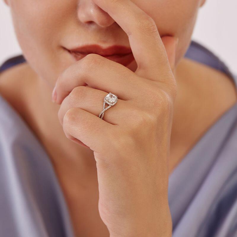 Two bands cross over each other near the center stone, giving a unique look to the whole ring. The two rows of accents entwined together, leading the complementing stones to serve as the halo and maximize brilliance. Ask for her with this ring, and she will remember this forever moment.