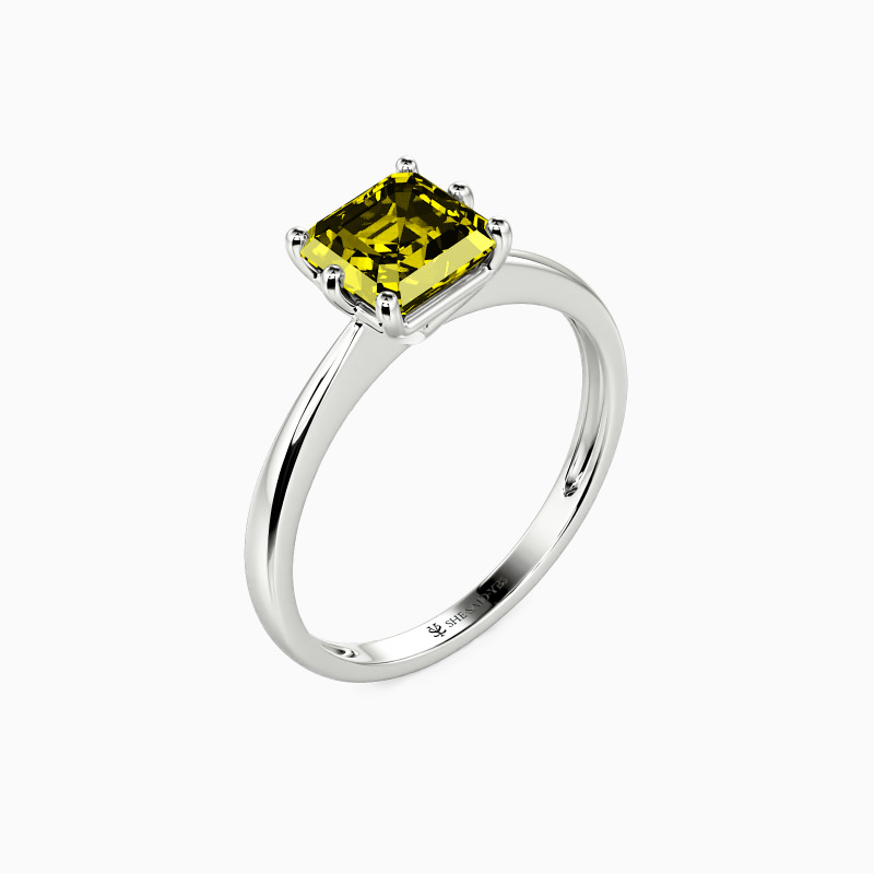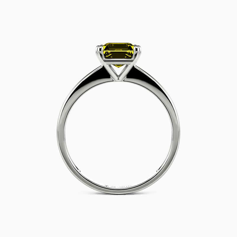 This brilliant Asscher cut solitaire features clean, finest lines and exquisitely tapered shoulders arching toward the center stone. With this solitaire design, you will forever be in that shine state of mind.