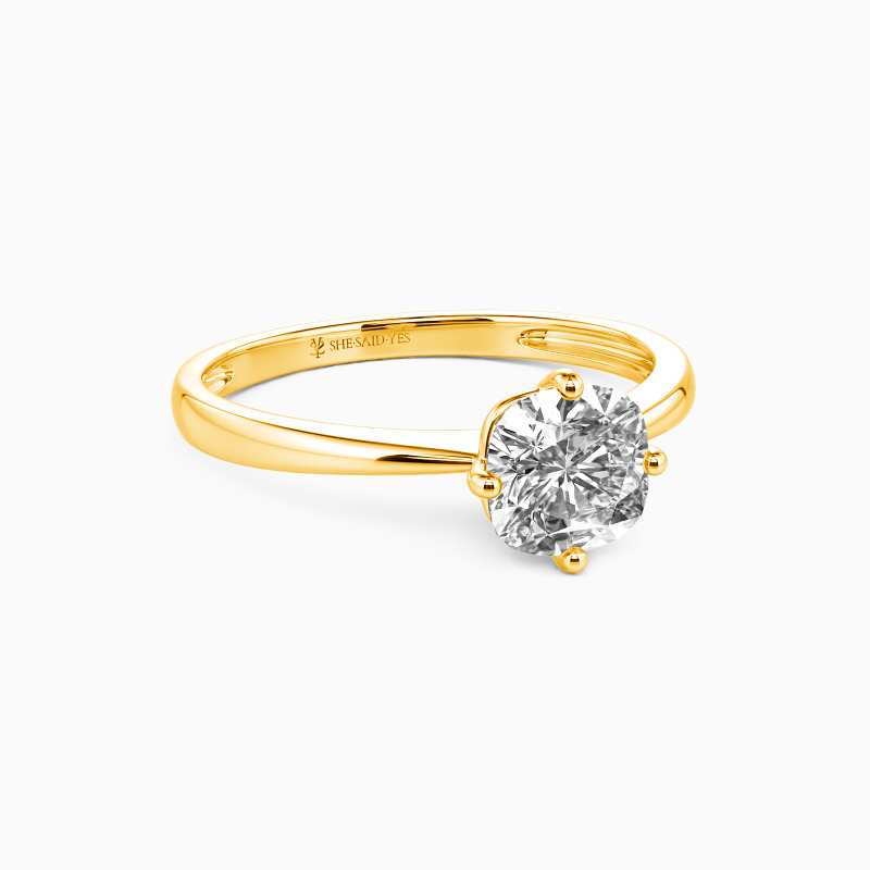 This brilliant Cushion cut solitaire features clean, finest lines and exquisitely tapered shoulders arching toward the center stone. With this solitaire design, you will forever be in that shine state of mind.
