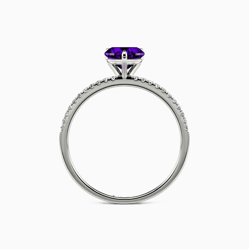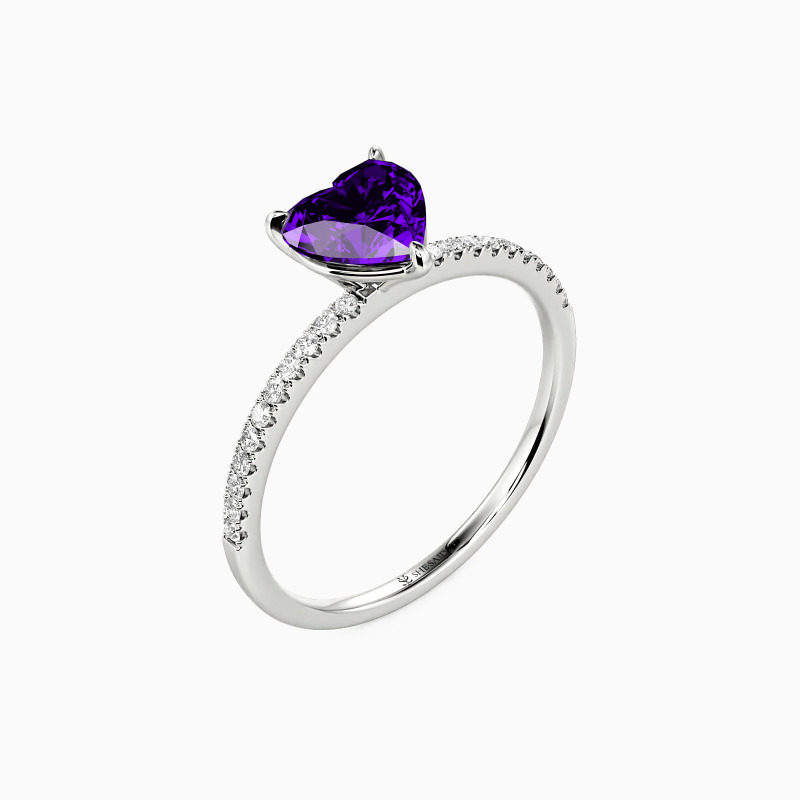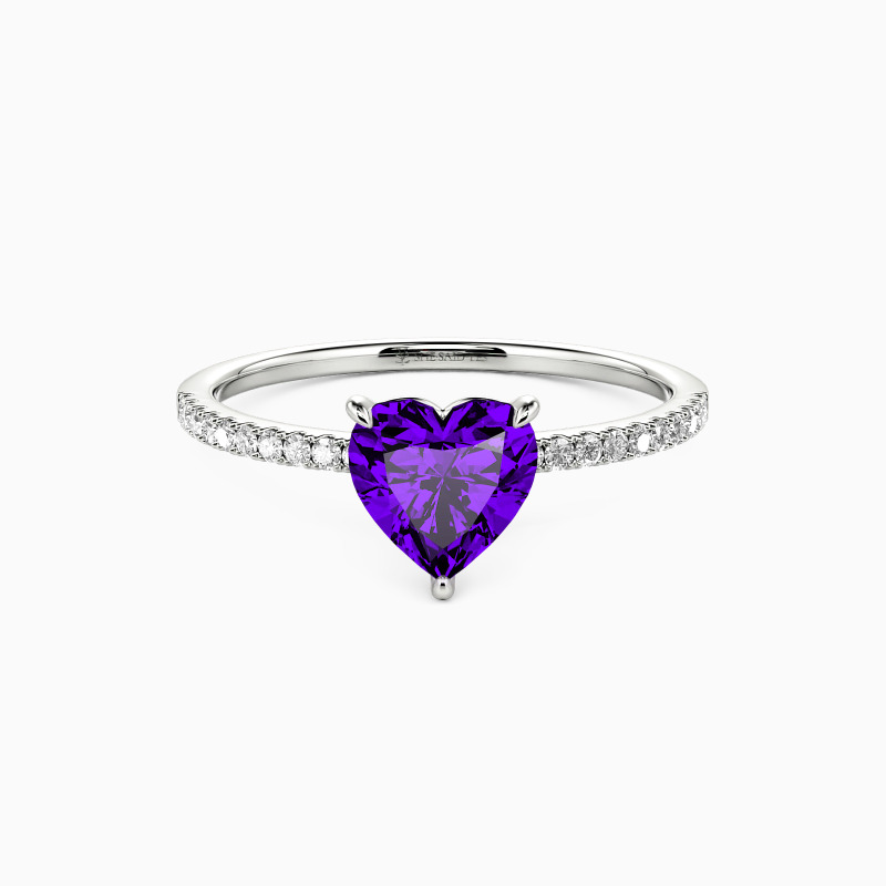 Attracting your eyes with the shimmering heart-cut center stone in a classic prong setting, this delicate engagement ring adds extra splendid charm and magnificence to you by studding a series of brilliant pavéd accents on the shank. You are magical, and you play through my mind like a symphony.