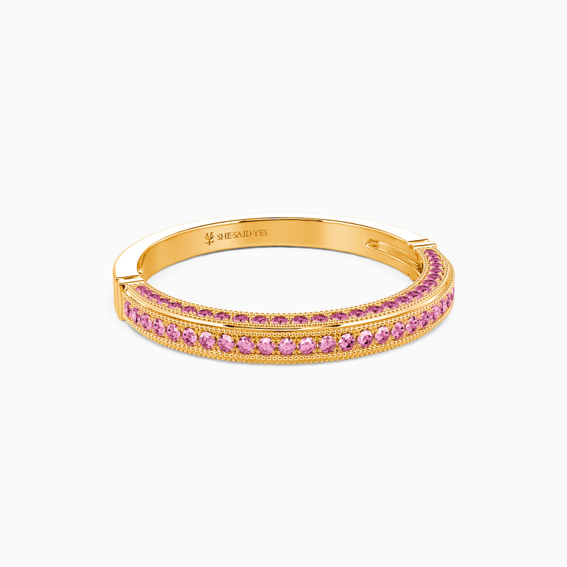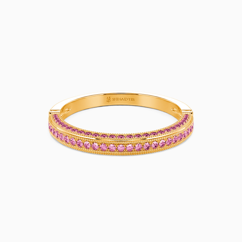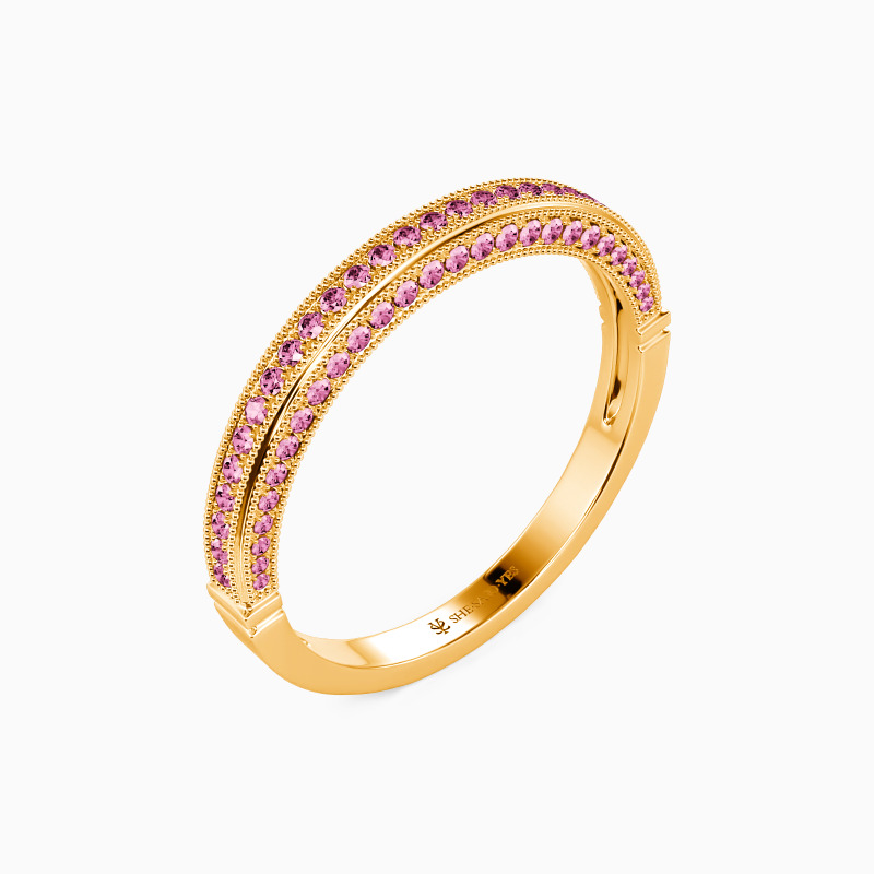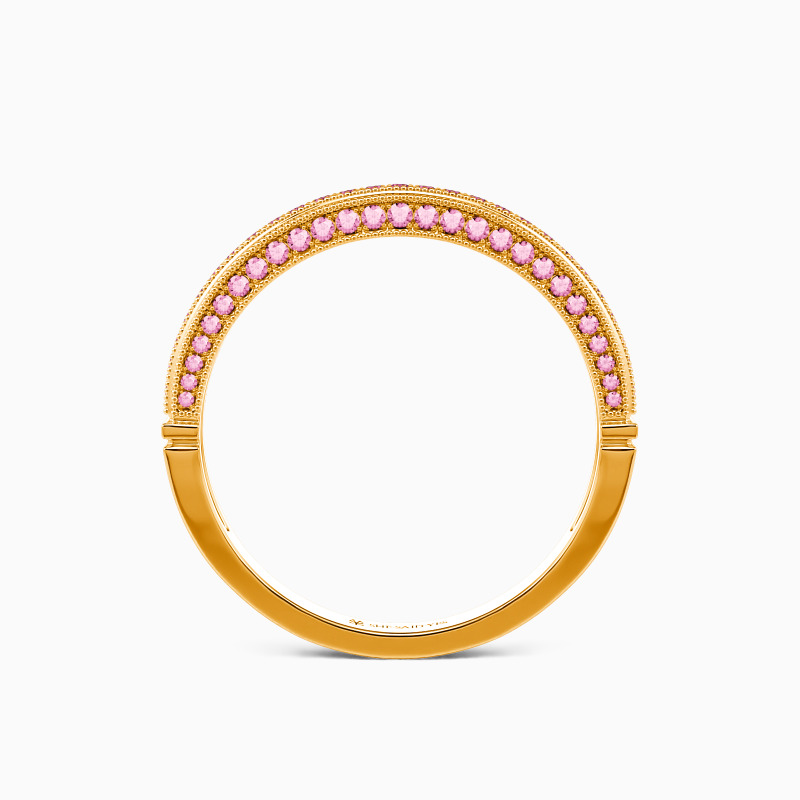 A fine series of small glittering stones in a pavé setting on each side of a delicate shank. And milgrain detailing adds a splash of vintage touch to the overall look, making it a perfect match with your engagement ring or evoke the resplendent glamour alone. Wear this ring to present your timeless appeal and beauty.