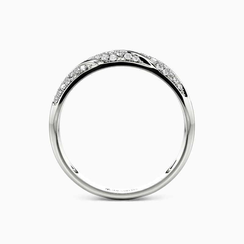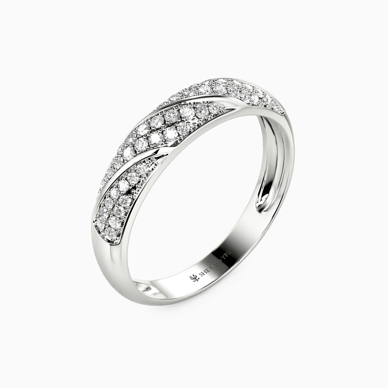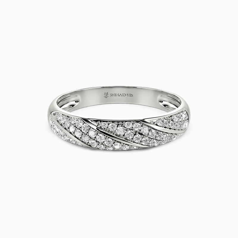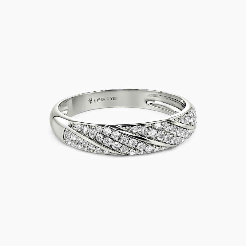 A stylish expression of your true love to witness the moments that bring you together. Shimmering round-cut accents in a pavé setting are separated by polished metal lines to create a geometric aesthetic vision. A stunning bridal set appears if you stack it with your engagement ring, or you can wear it alone to match attires.