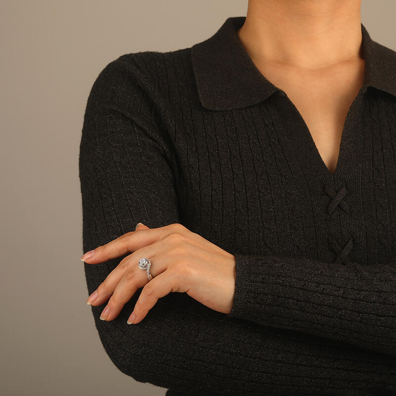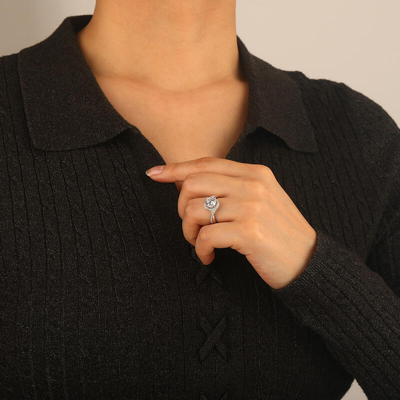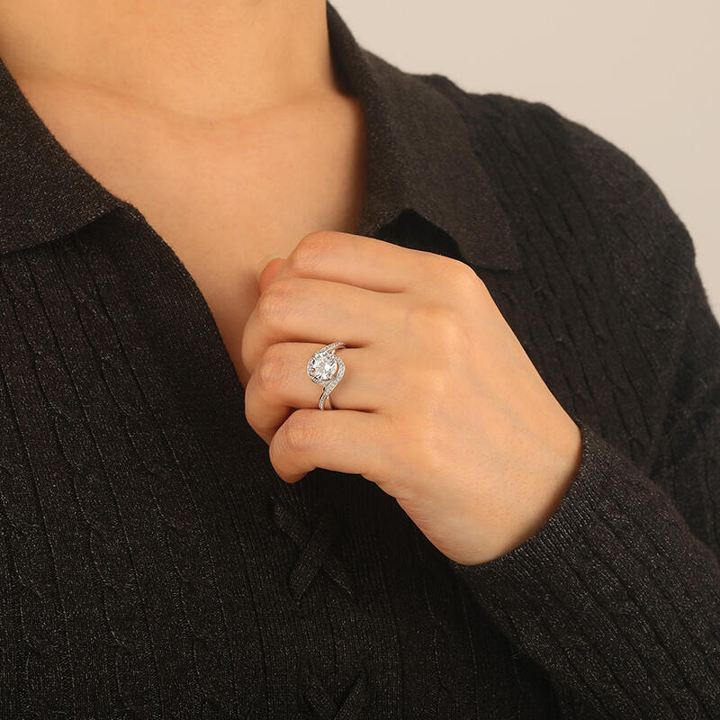 Two rows swirling halo emphasizes the unique silhouette of this engagement ring. Accented with a bypass pavéd shank, the overall finish is vibrant and captivating. This vintage design symbolizes two souls coming together in one union. So pick this ring for her, and hold her hands forever.