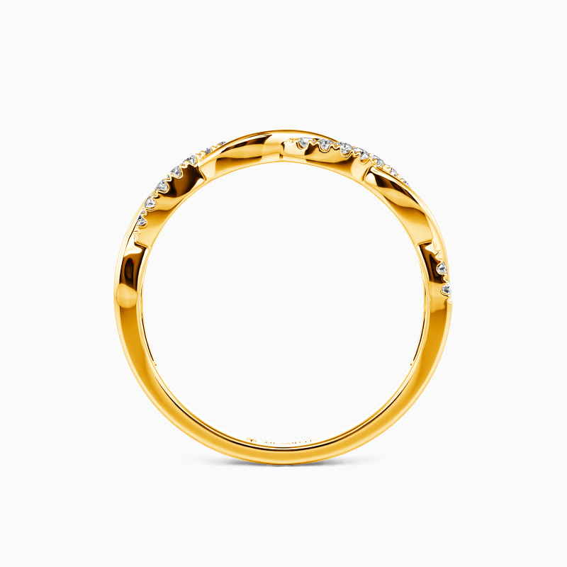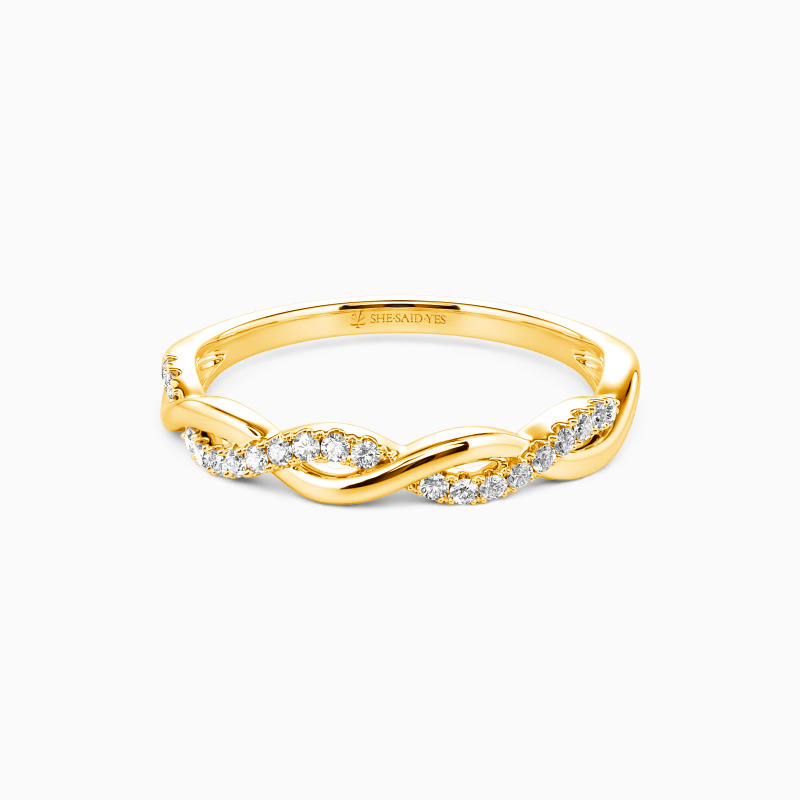 Contemporary design for the chic bride-to-be. This eye-catching wedding band is completed by one shank set with dazzling pavéd stones and the other a highly polished metal finish. They intertwine with each other to create this unique look and witness your exchanged souls. Love is giving freedom, and I promise you to love you all forever.
