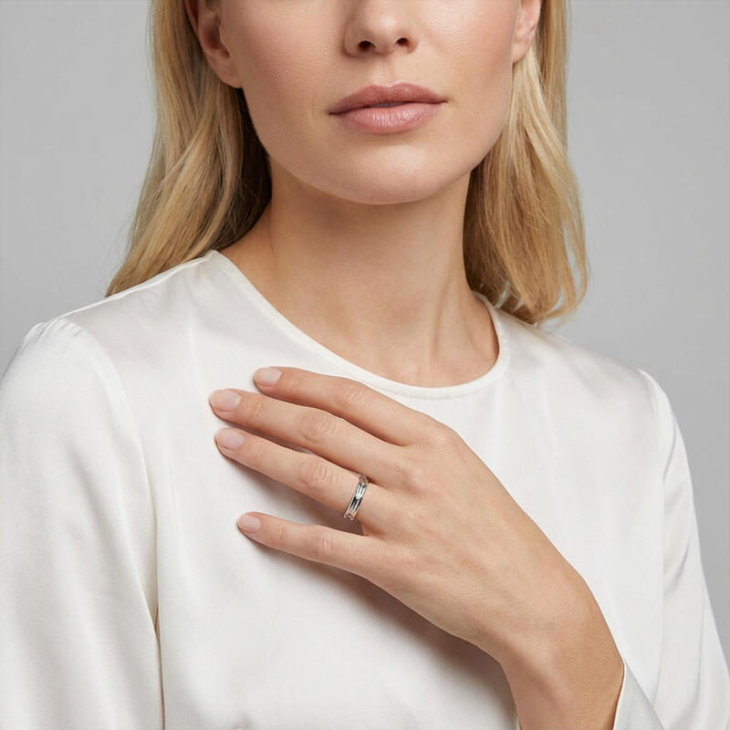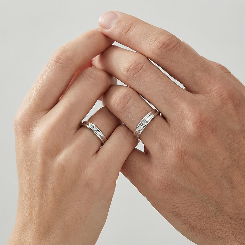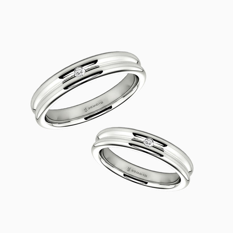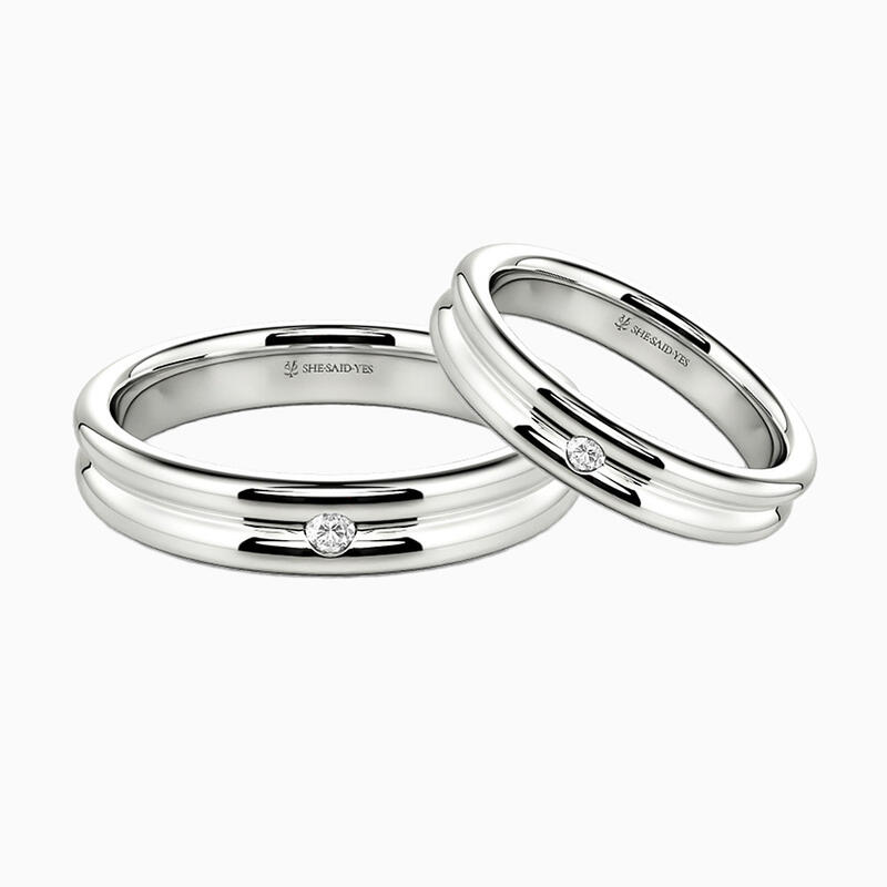 These couples' rings feature matching double-band designs with high-polish finish. The women's band adds a single round diamond between its bands, while the men's band maintains pure metallic simplicity. Their shared mirrored surfaces create visual harmony, making this set ideal for couples who appreciate subtle distinction within unity.