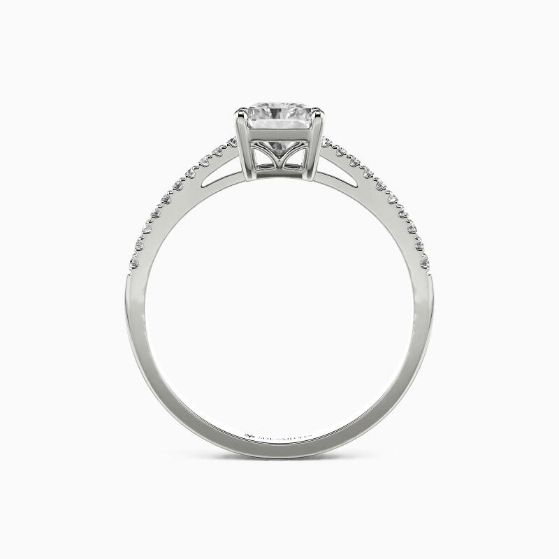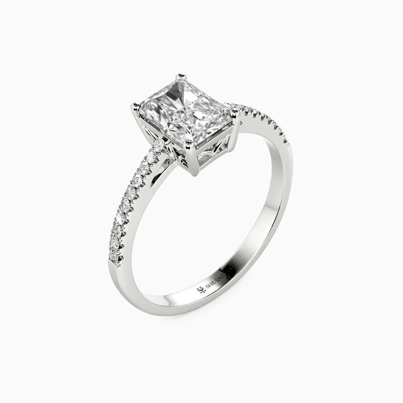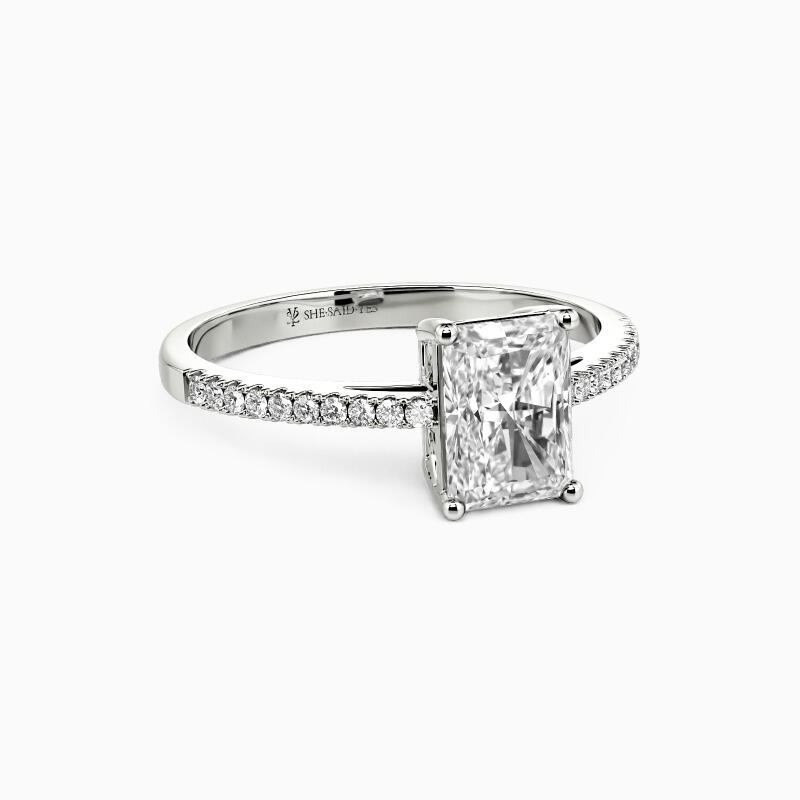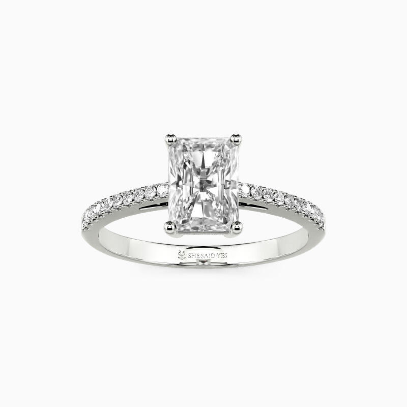Elegant and elaborate. As the idealist type to enhance her incredible charm, this side stone ring is the best option to accentuate the dazzling glamour of the radiant-cut center stone. Adorned with the shimmering gems pave shank, this ring will make a striking impression on your perfect wedding.