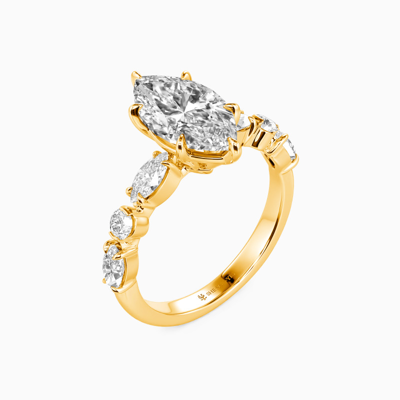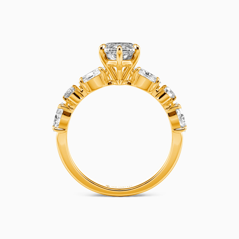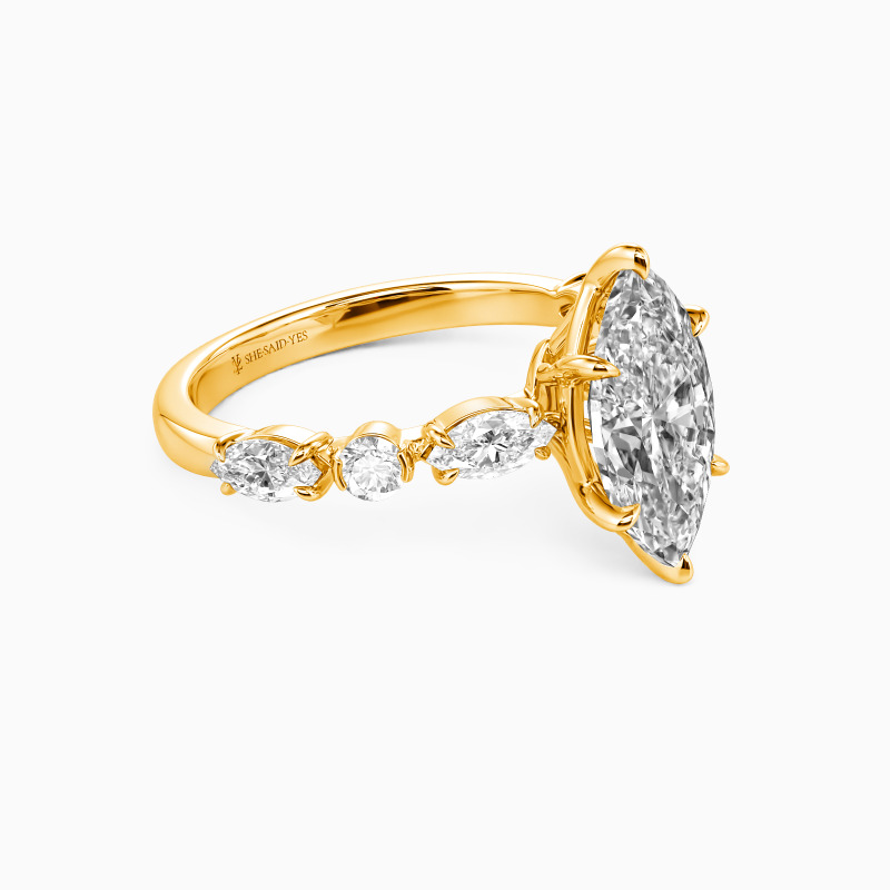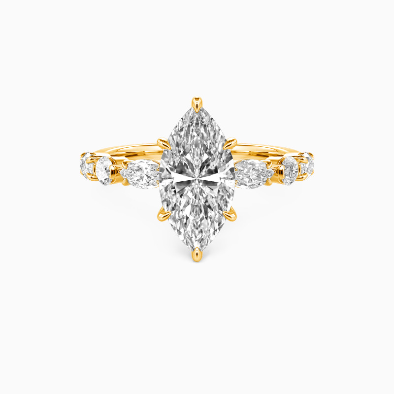 This exquisite side-stone engagement ring features a striking marquise center stone, elegantly elongated to enhance its brilliance and create a flattering silhouette. Framed by a delicate array of marquise and round accent stones, the design exudes timeless sophistication with a touch of modern flair. Perfect for the bride who loves classic elegance with a hint of boldness, this ring captures light effortlessly, ensuring a dazzling display from every angle.