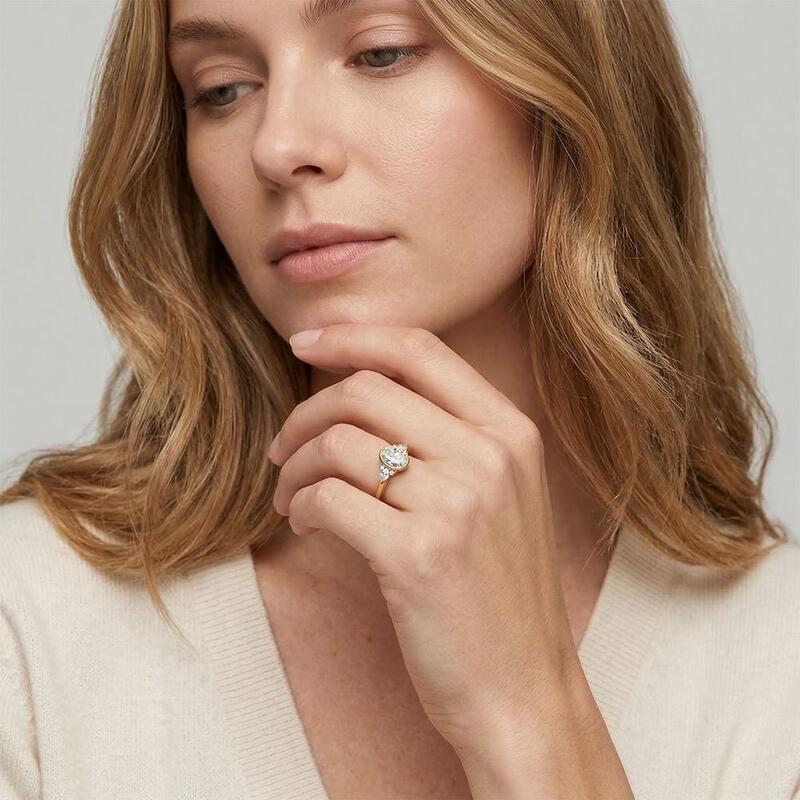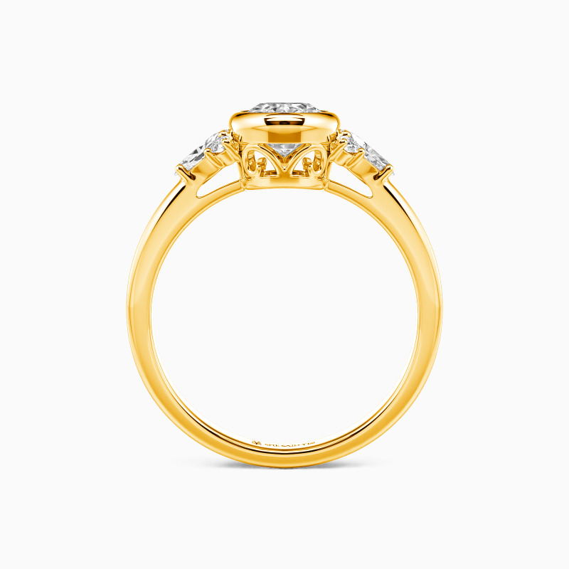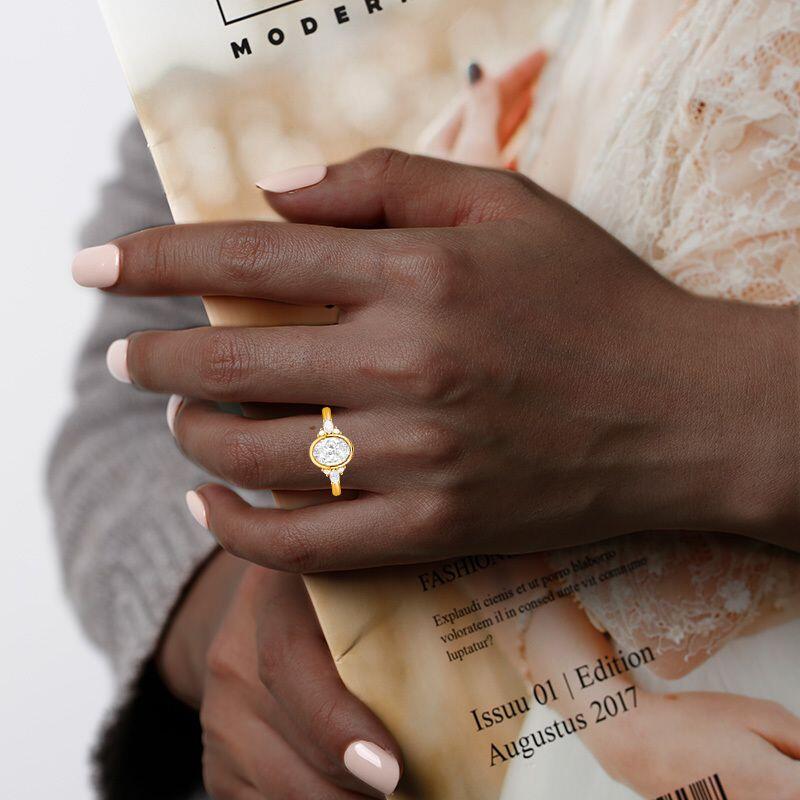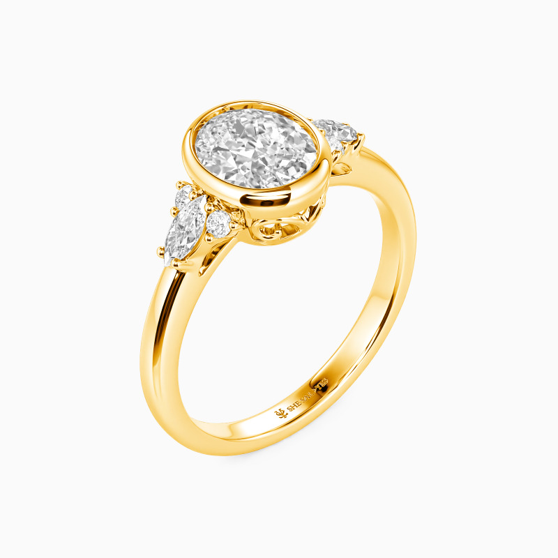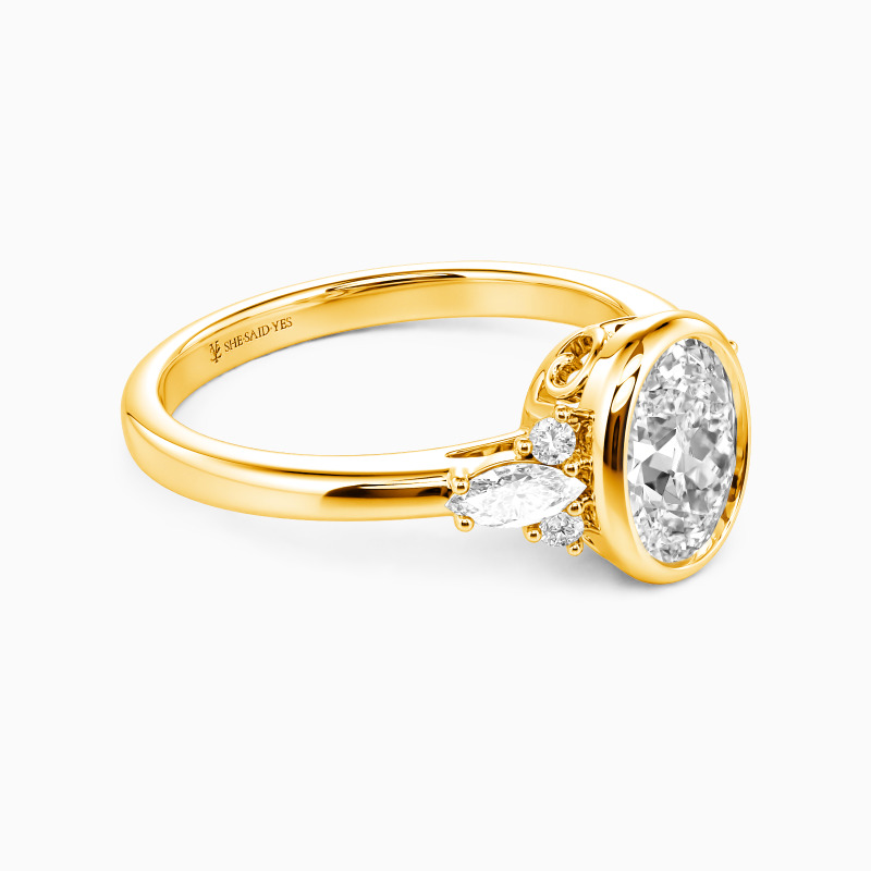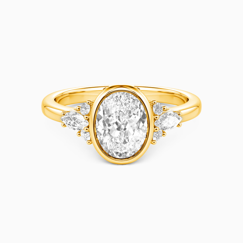 This elegant engagement ring features a captivating oval centerpiece, secured in a sleek bezel setting. Flanking the main stone, artful clusters of marquise and round gems create a dazzling display on each side. The harmonious design symbolizes the multifaceted nature of love, resulting in a timeless treasure for life's most precious moments.