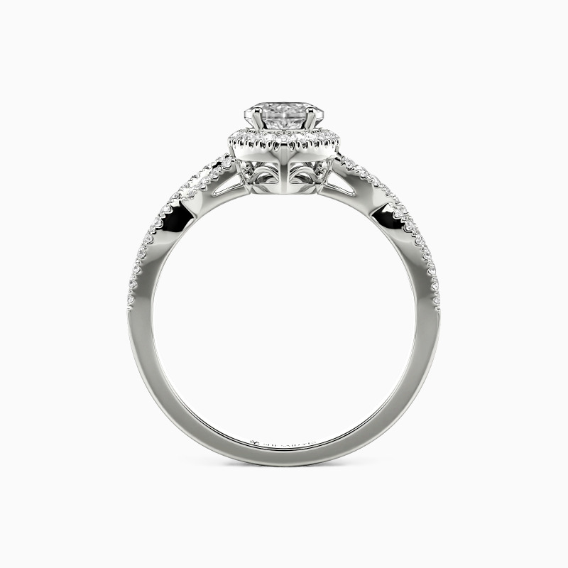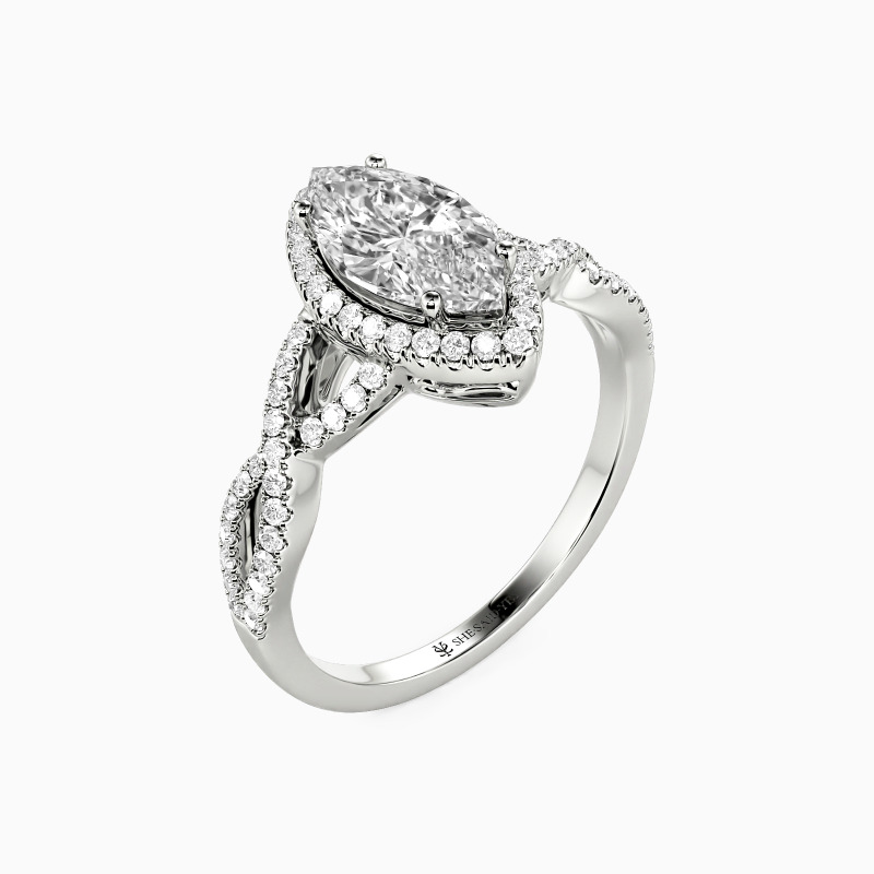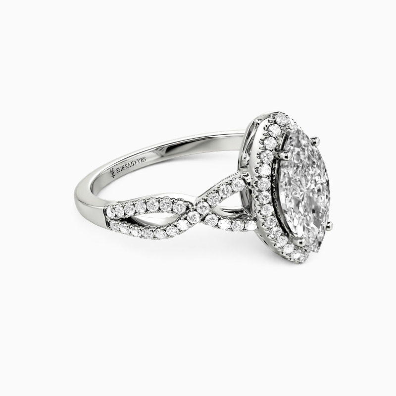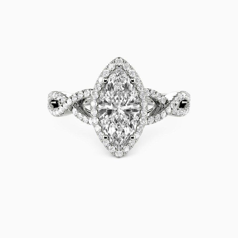 This breathtaking engagement ring features a regal marquise-cut center stone, elongated and luminous for striking brilliance. Encircled by a sparkling halo, the design enhances its dramatic silhouette, while the delicate twisted pavé band adds a touch of vintage-inspired elegance. A perfect harmony of bold grace and intricate detail, this ring is a radiant symbol of enduring love.