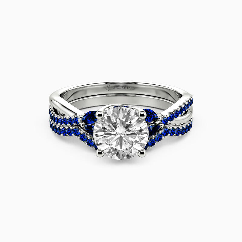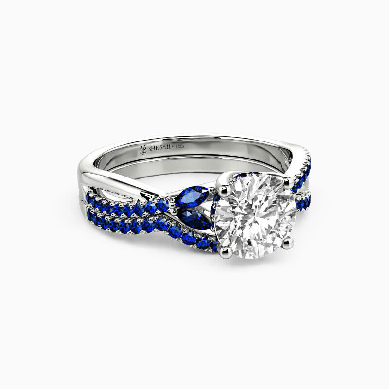 This exquisite bridal set is a true symbol of everlasting love and elegance. A round-cut center stone sparkles above high, complemented by a hidden halo for an added touch of brilliance. Four marquise side stones gracefully enhance the beauty of the centerpiece. The cross-over design of the shank adds a unique flair, with one half adorned with dazzling gems while the other half remains elegantly plain. Completing this enchanting set is a matching curved wedding band meticulously paved with sparkling gems, creating a seamless and captivating ensemble.