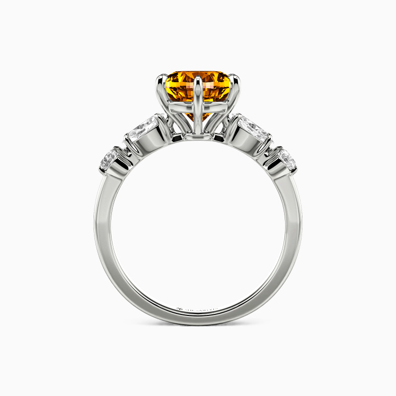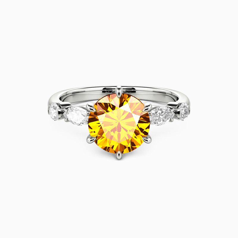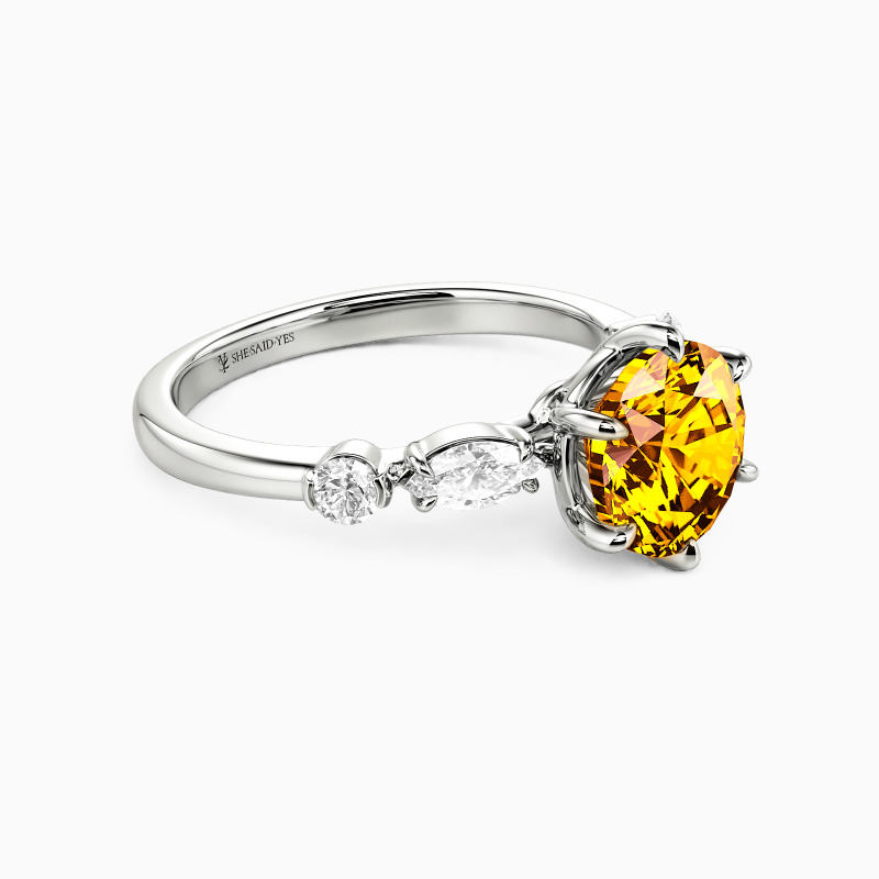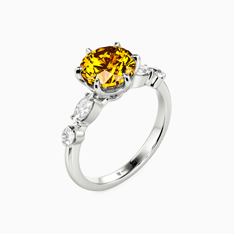 This exquisite side-stone engagement ring features a luminous round center stone, elegantly framed by a graceful arrangement of marquise and round accents. The alternating shapes create a sophisticated yet dazzling effect, enhancing the brilliance of the central gem. Perfect for those who adore timeless glamour with a touch of modern refinement, this design symbolizes enduring love and radiant beauty.