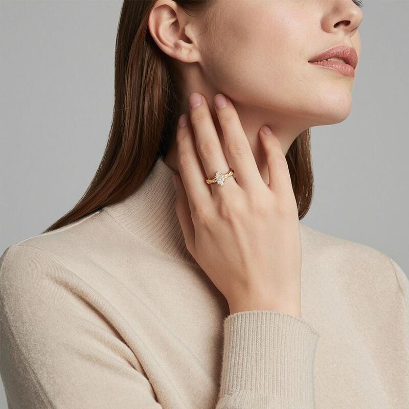A dazzling marquise-cut center stone is nestled within six claws, standing perfectly on the intertwined shank. A row of sparkling accent stones is paved on one ribbon, adding extra sparkle and chic to the entire ring.