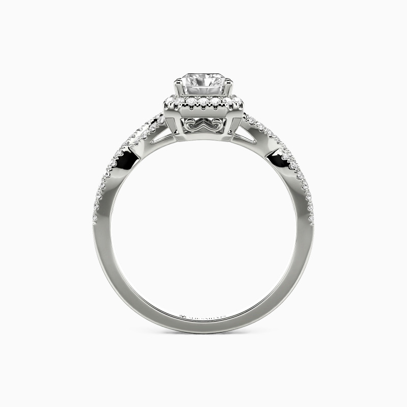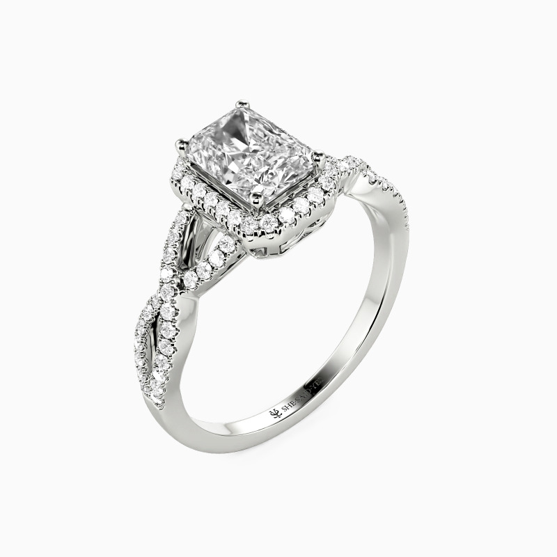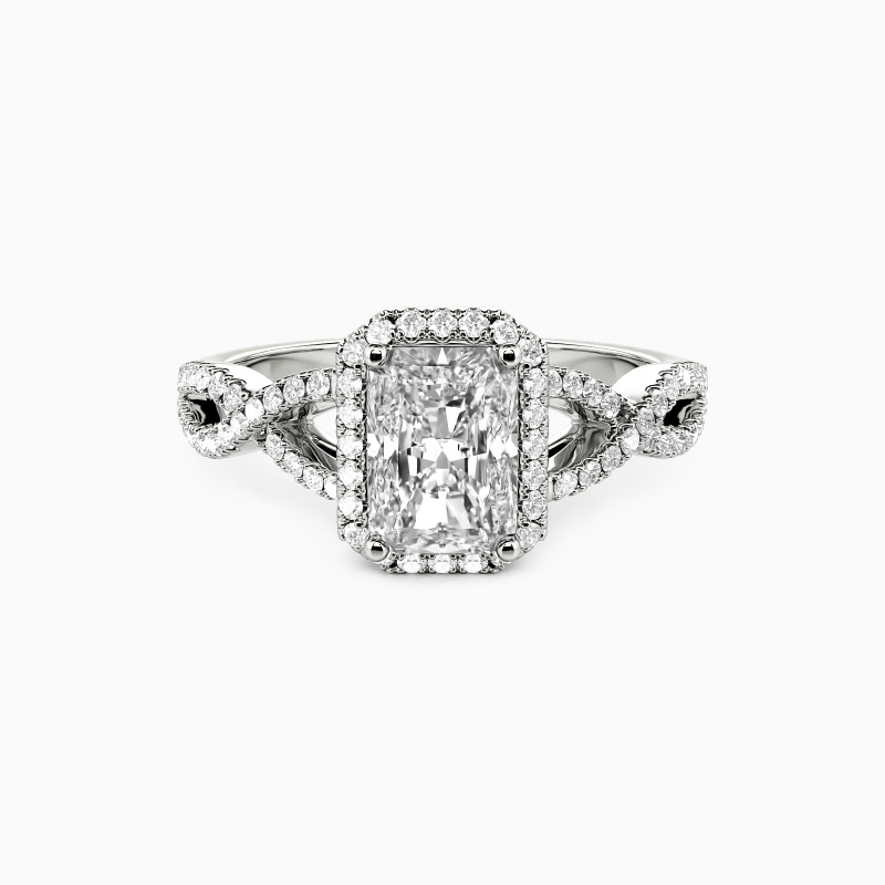 This exquisite engagement ring captivates with a radiant-cut center stone, its brilliant facets reflecting light in a dazzling display. Encircled by a delicate halo of shimmering accents, the design exudes sophistication, while the twisted pavé band adds a touch of modern romance. The intricate interplay of textures and sparkle makes this ring a breathtaking symbol of enduring love.