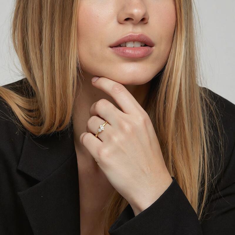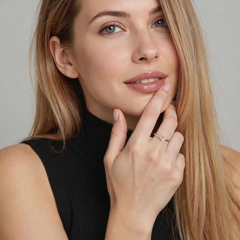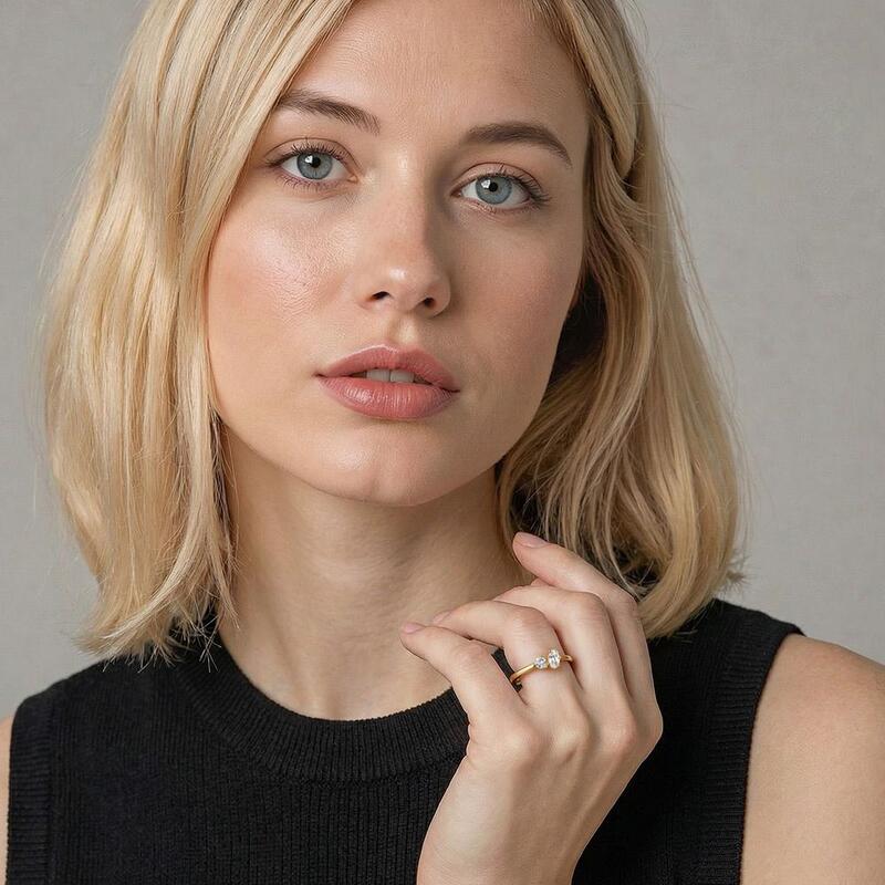 This Toi et Moi ring features an oval and a round stone set at a subtle angle, creating a graceful and modern silhouette. The design suggests a quiet conversation between two distinct forms, symbolizing a union that celebrates both harmony and individuality. Its elegantly balanced composition offers a fresh perspective on a classic concept.