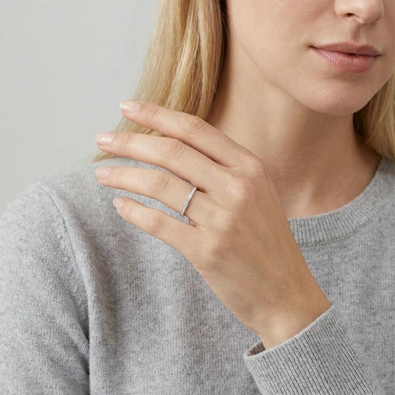 These rings mirror each other in brilliance yet celebrate individuality. The women's ring features a sleek, straight band adorned with sparkling diamonds, exuding modern refinement. The men's band embraces soft, rounded edges, cradling a row of gems for a bold yet balanced statement. Together, their shared radiance creates a harmonious tribute to unity, each design distinct yet undeniably connected.