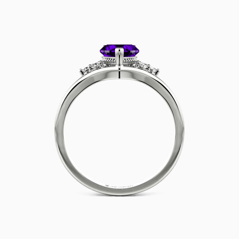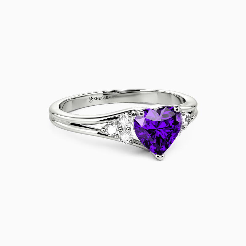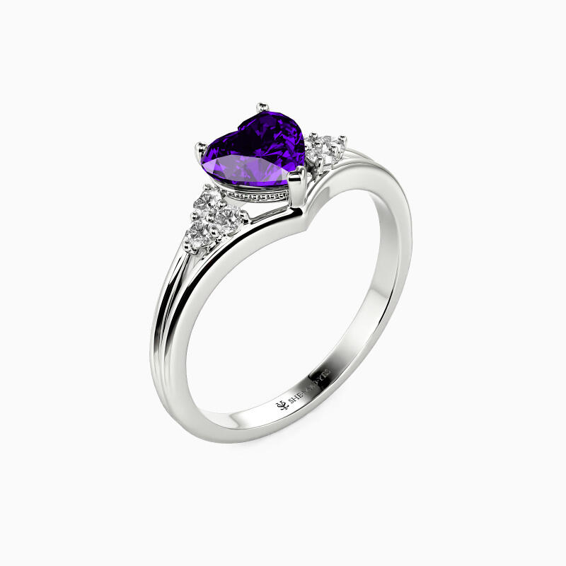 A Heart-shaped stone is set in three prongs; three small accents surround a triangle shape glistening on each shoulder; the split shank elevates this engagement look and completes this style. Promised from the day forward, she will never walk alone, your heart would be her shelter, and your arms would be her home.