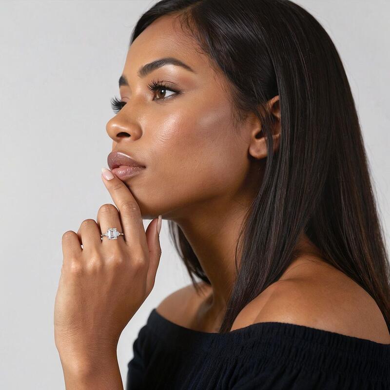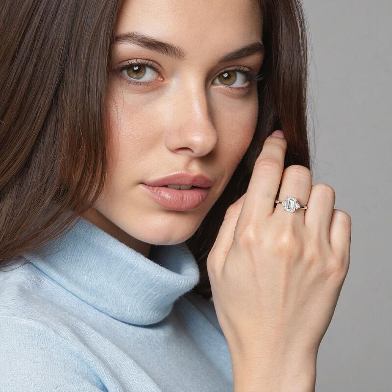 This Art Deco-inspired engagement ring features a clean-lined emerald-cut center stone, elegantly flanked by baguette and round accents. The geometric precision of the design creates a striking architectural statement, while the interplay of shapes delivers a captivating play of light and shadow, resulting in a piece of timeless, modern elegance.