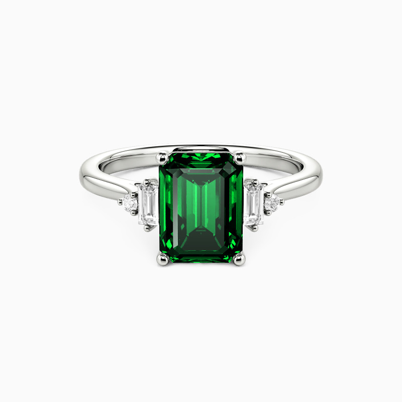 This Art Deco-inspired engagement ring features a clean-lined emerald-cut center stone, elegantly flanked by baguette and round accents. The geometric precision of the design creates a striking architectural statement, while the interplay of shapes delivers a captivating play of light and shadow, resulting in a piece of timeless, modern elegance.
