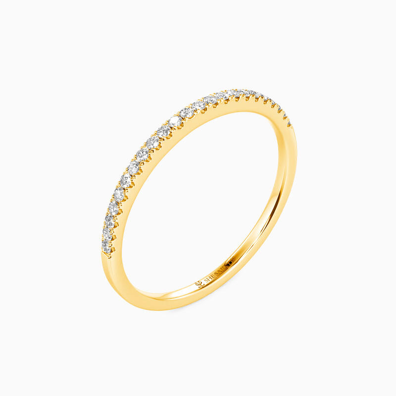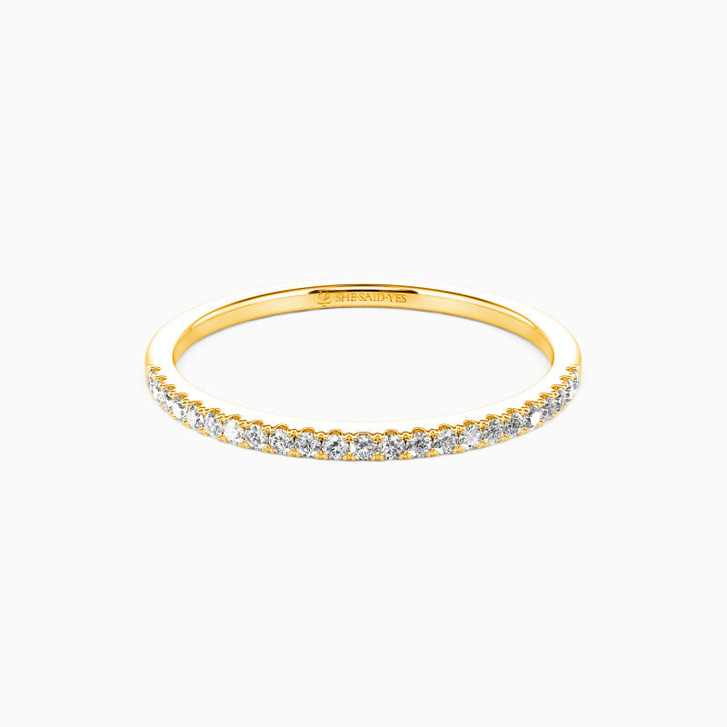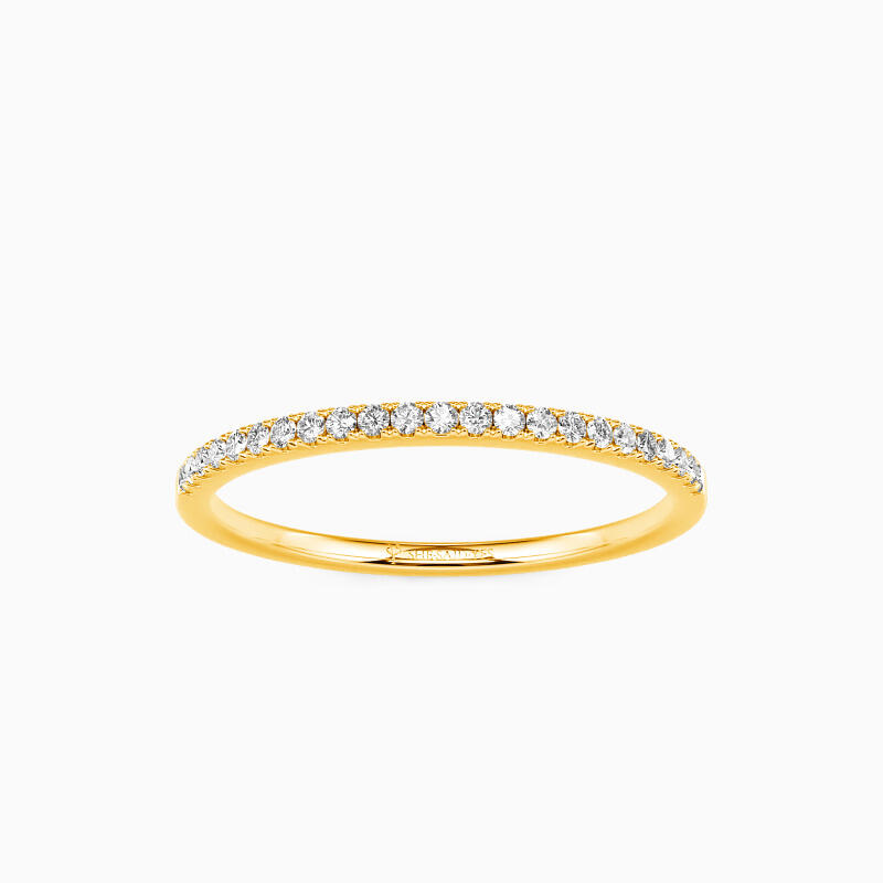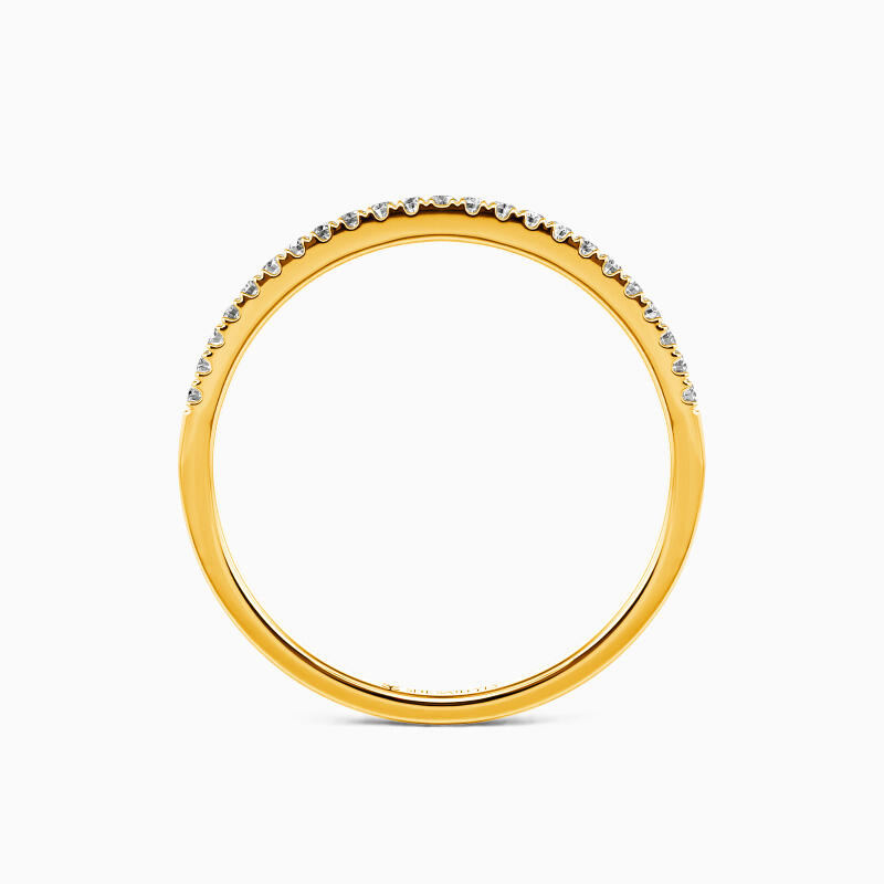 Gleaming accents and polished shank combine in a simple design you can wear every day. You could never go wrong with such a classic half eternity wedding band. It portrays your elegance effortlessly in its shining beauty. Stacking with your engagement ring or wearing it solo is both an ideal choice; this timeless design is a dazzling symbol of your love.