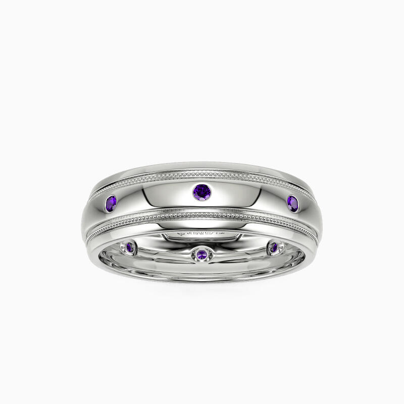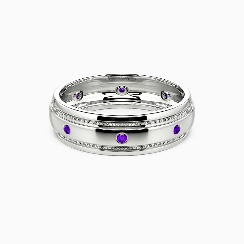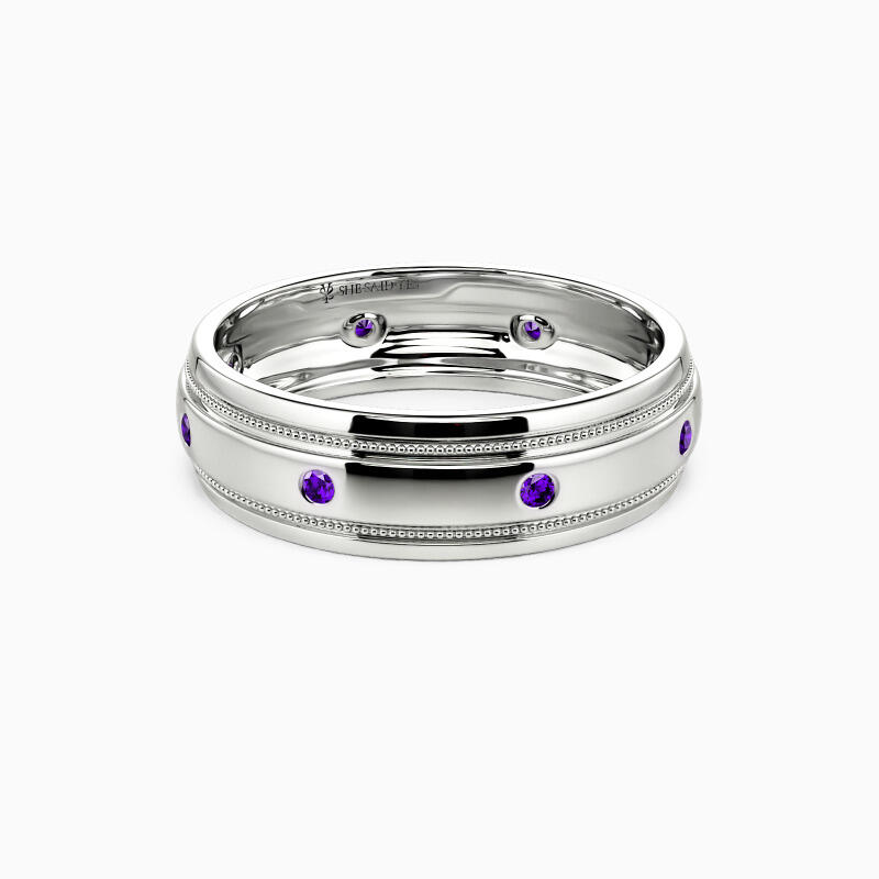Simple yet striking, this timeless wedding band is sure to draw your attention with its classic appeal. It is lustrous with a highly polished shank. Eight shimmering round-cut accents are set in a bezel setting to enhance its brilliance, while the milgrain adds vintage details to show your gentleness.