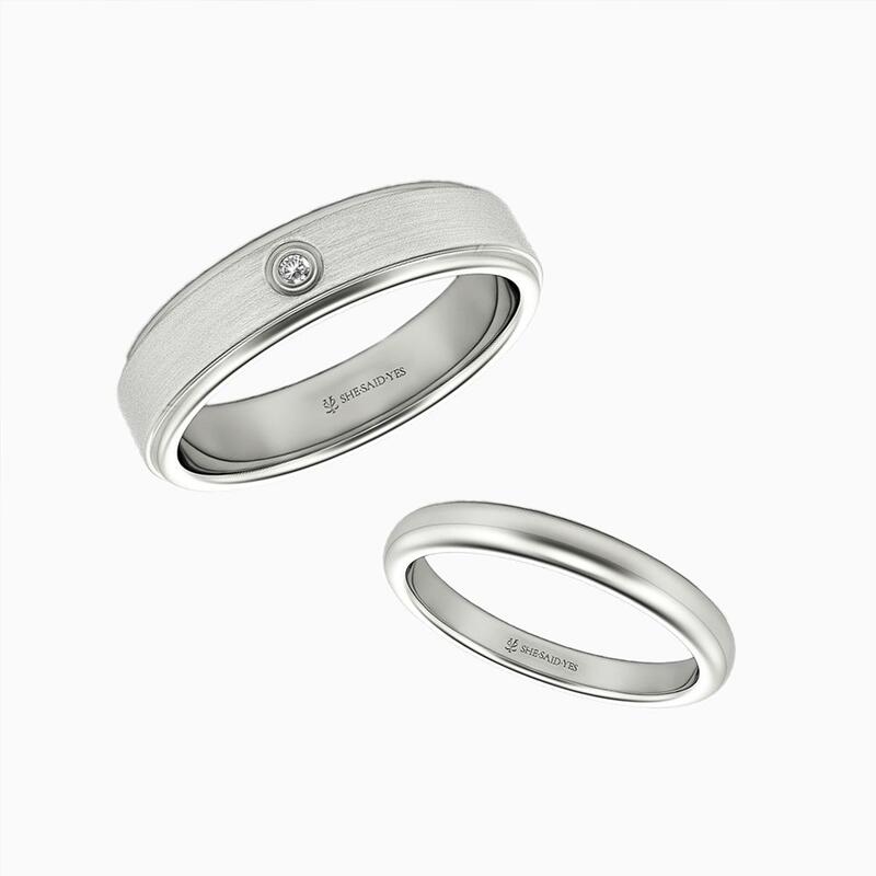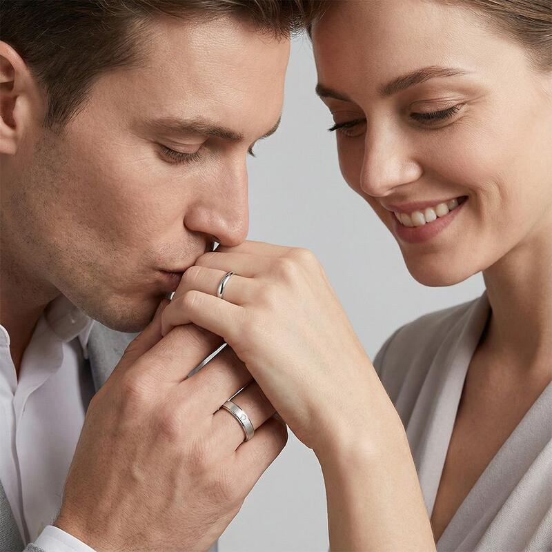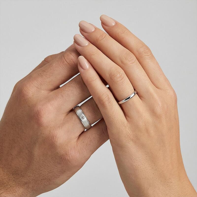 A harmonious interplay of light and texture for two. The women's ring glows with softly rounded edges and a mirror-like high-polish finish, exuding effortless elegance. Its partner contrasts with bold, stepped edges and a tactile brushed finish, lending rugged sophistication. Though distinct in character, their shared commitment to refined craftsmanship makes them a perfect pair—subtle yet unmistakably linked.