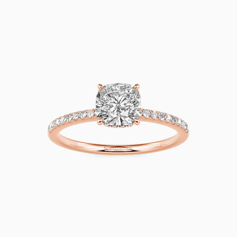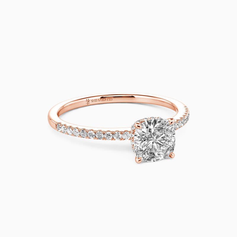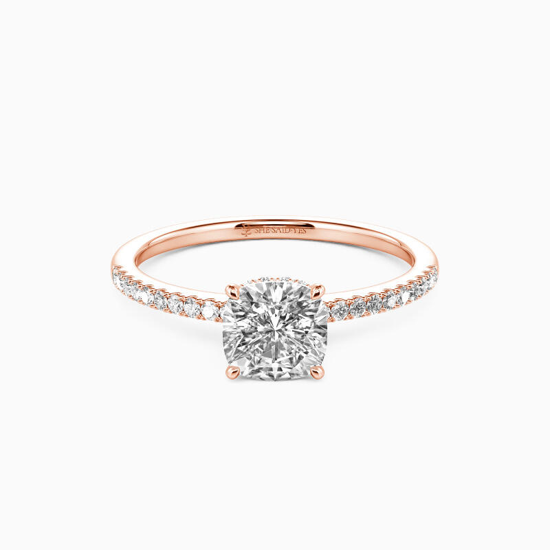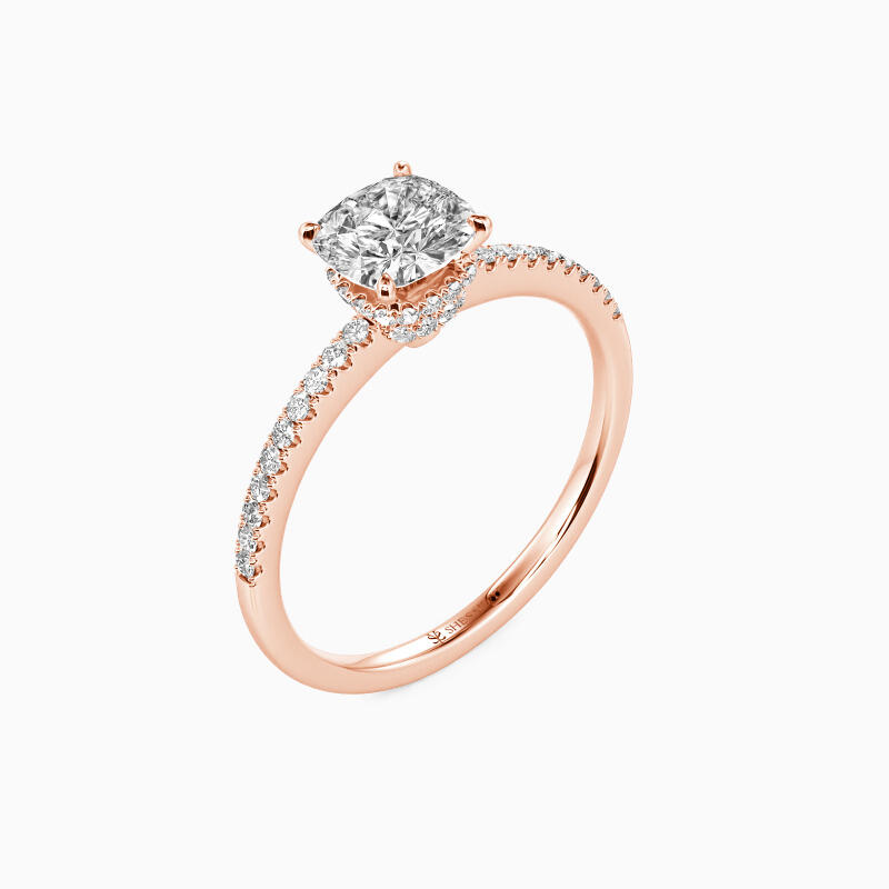Never out of date, this engagement ring features a glittering cushion cut stone nestled into a floral hidden halo setting; micro paves line the shank on each side for additional sparkle. If you don't know which style to choose, this one is never wrong.