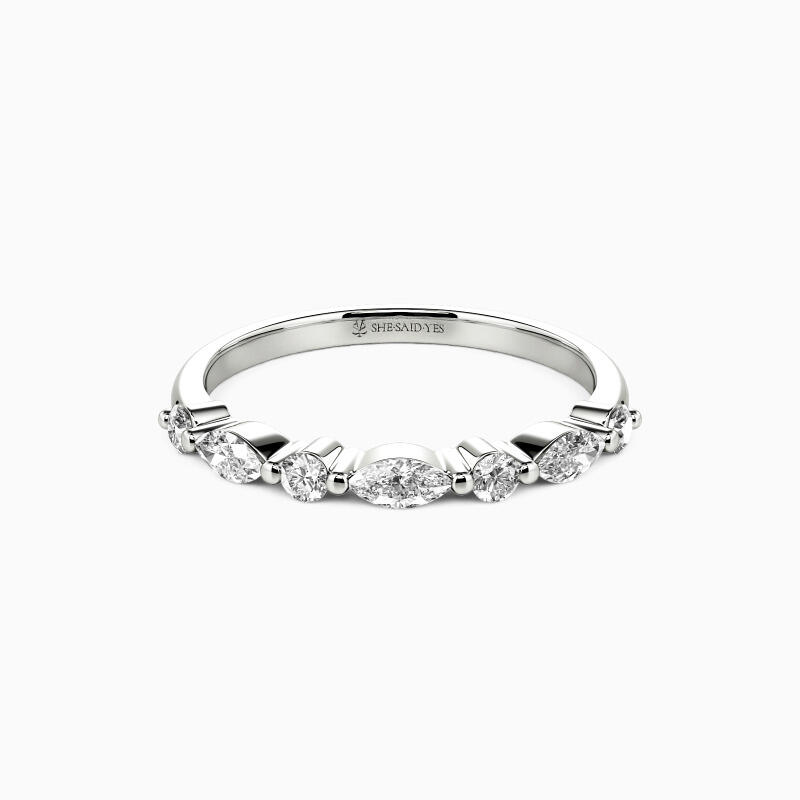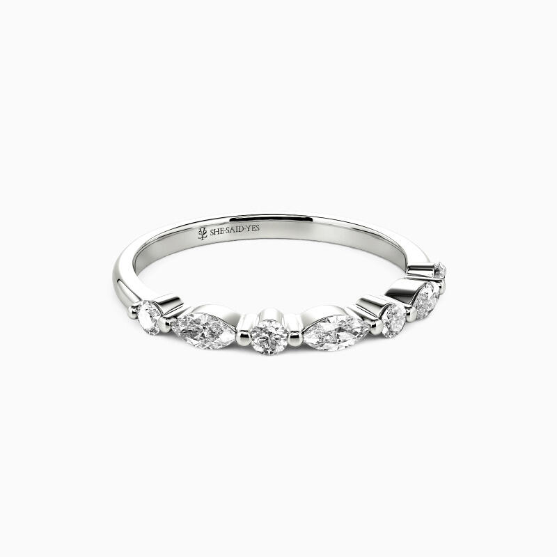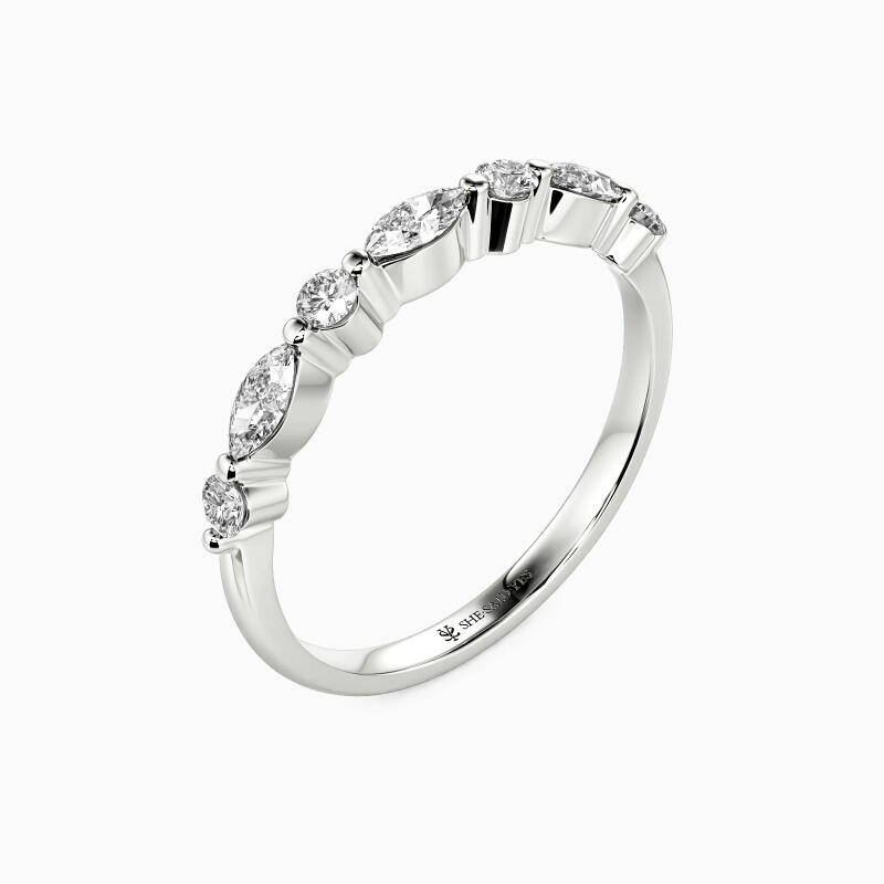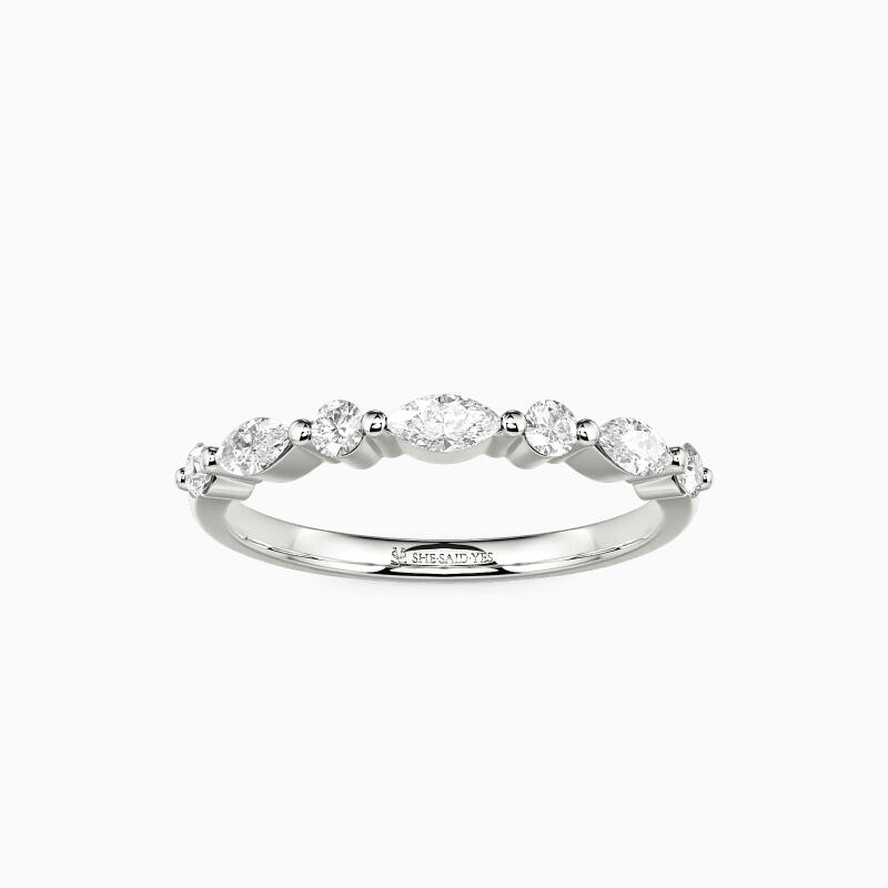 Elegant and captivating, this classic wedding band is an ideal complement to engagement rings. It features a harmonious blend of round and marquise-cut stones, meticulously set in shared prongs along the polished shank. The alternating arrangement of these stones creates a mesmerizing pattern that exudes a radiant sparkle from all perspectives. This band not only enhances your allure but also adds an enchanting shimmer to every gesture.