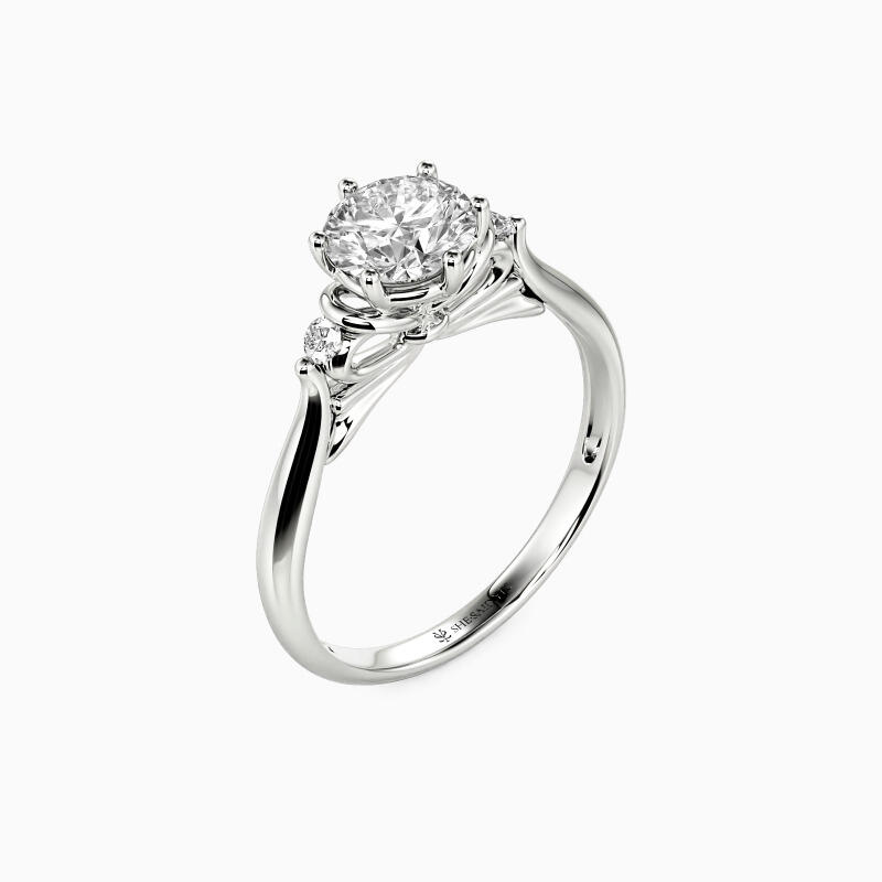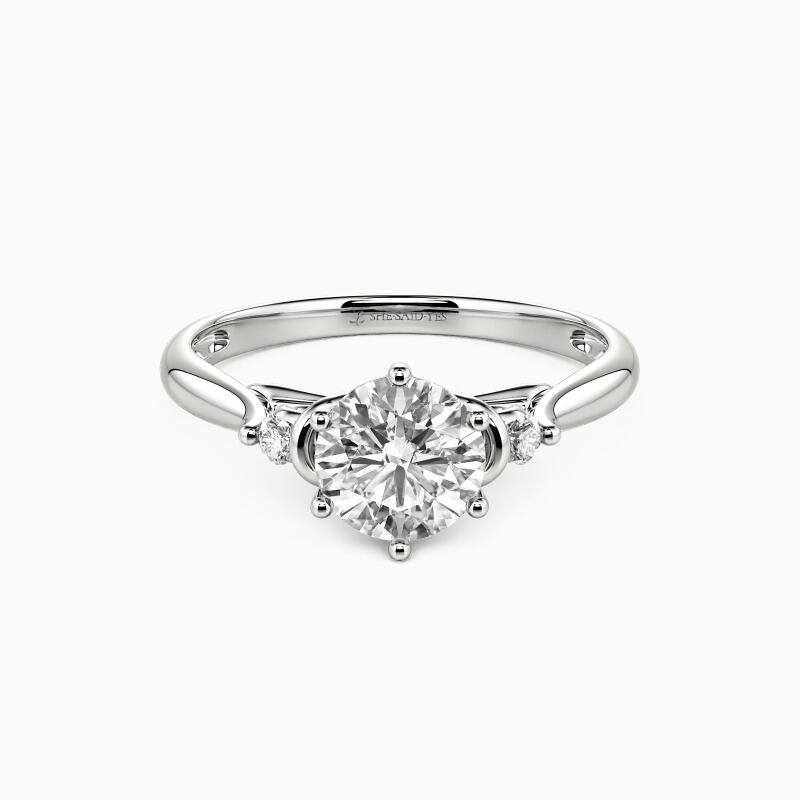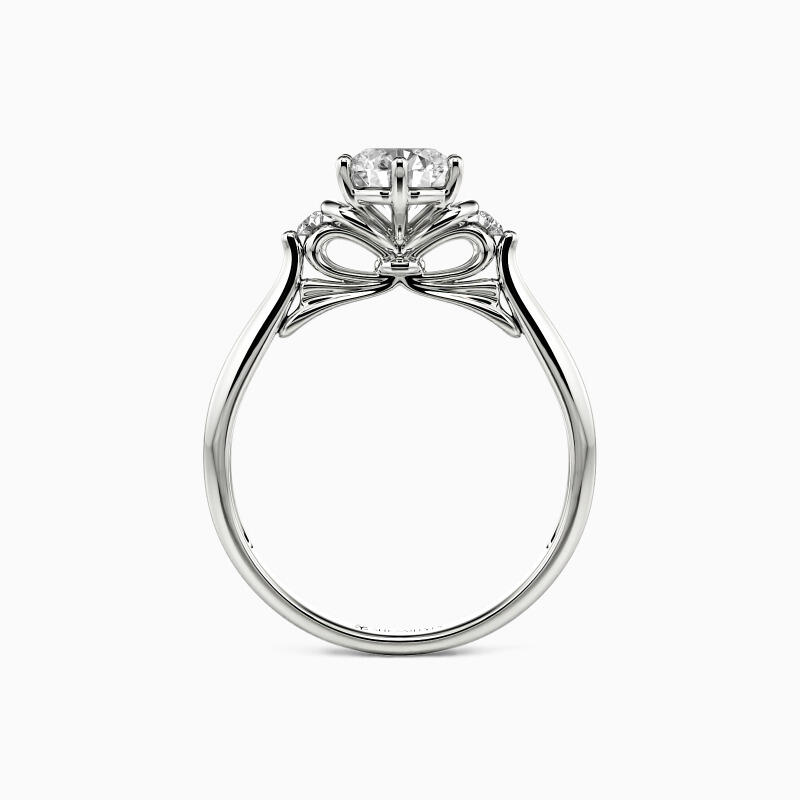 An unparalleled design for the bride-to-be with a maiden carefree heart. This three-stone engagement ring sets a round-cut accent on either side of the brilliance center stone with a plain shank. A unique bowknot design of the gallery completes the overall stylish look. Let her be your only one forever with this ring.
