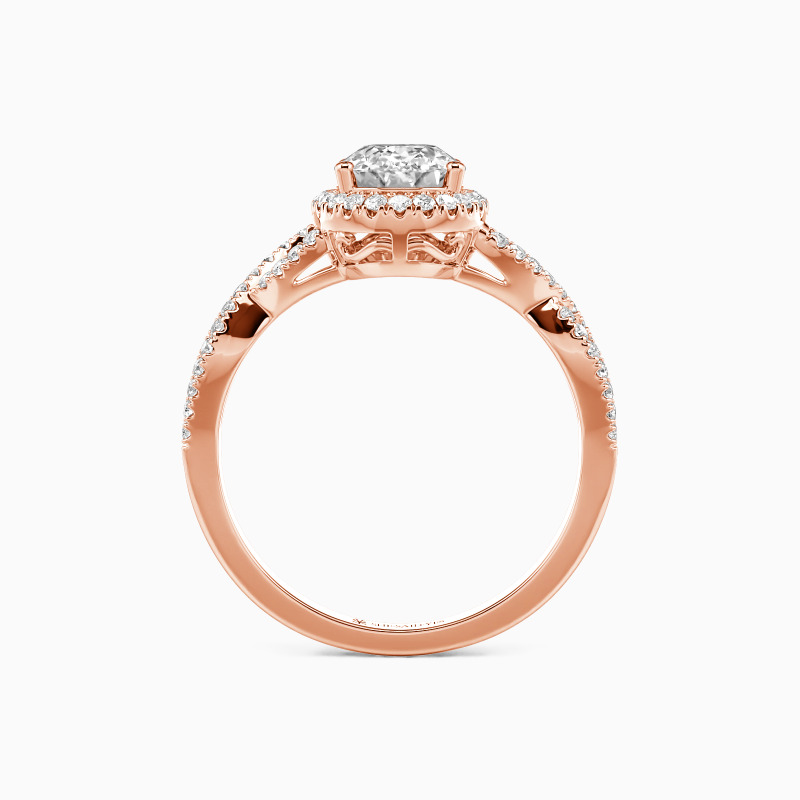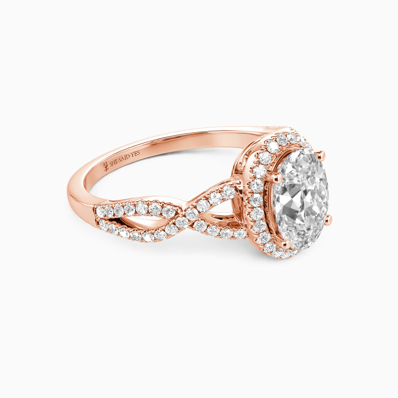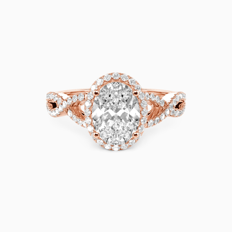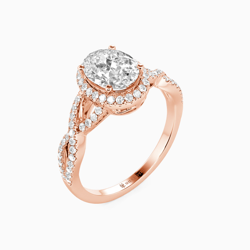 This exquisite engagement ring showcases a radiant oval-cut center stone, its elongated silhouette flattering and luminous. A shimmering halo amplifies its brilliance, while the gracefully twisted pavé band adds a touch of vintage romance. Timeless yet modern, this design is a celebration of love—both delicate and dazzling, just like your forever.