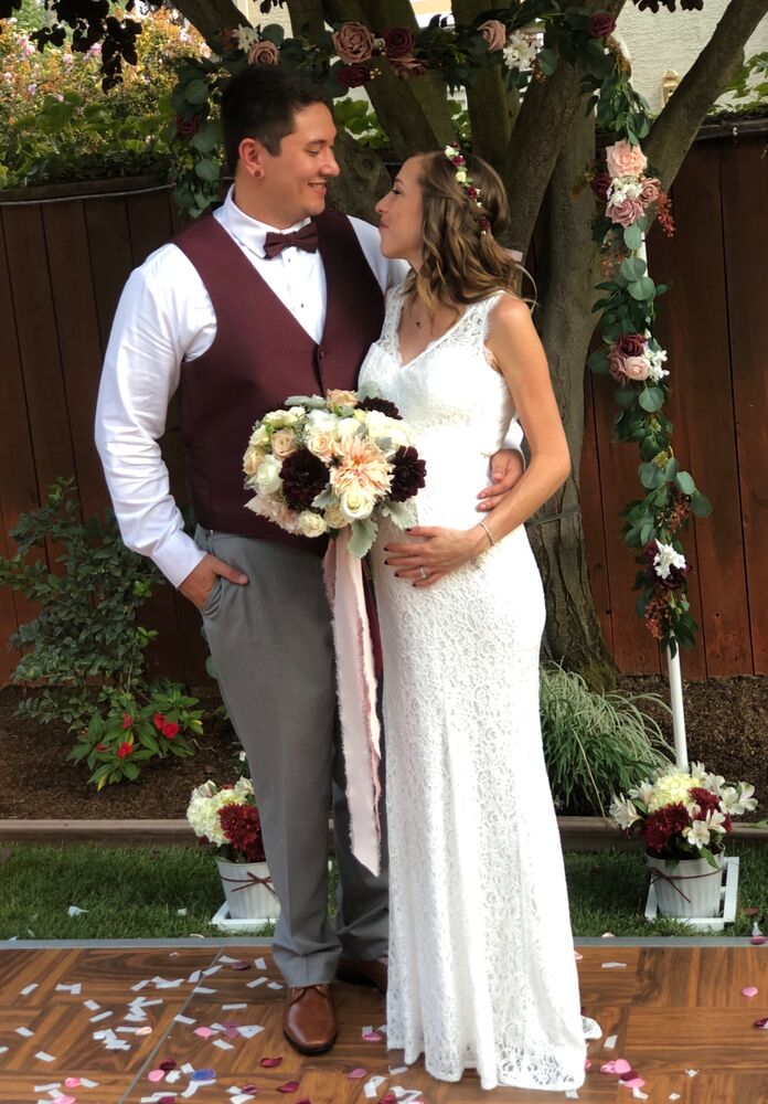 Melissa and I had been dreaming about our wedding day for years. The timing felt especially perfect since Melissa was entering her second trimester of pregnancy. We wanted something intimate with just close friends and family. In the end, we decided on a small ceremony in my parents' backyard in Wisconsin. The weather was beautiful - it was like the perfect fall day was made just for us. All our guests brought various homemade dishes for a big potluck reception. One of my best friends from college officiated the ceremony, which was casual but meaningful. I'll never forget how radiant Melissa looked walking down the aisle with a slight baby bump. Melissa surprised me by writing her own vows that had me tearing up. I'll always cherish the simplicity and love we brought to that special day, where we celebrated our love and growing family.